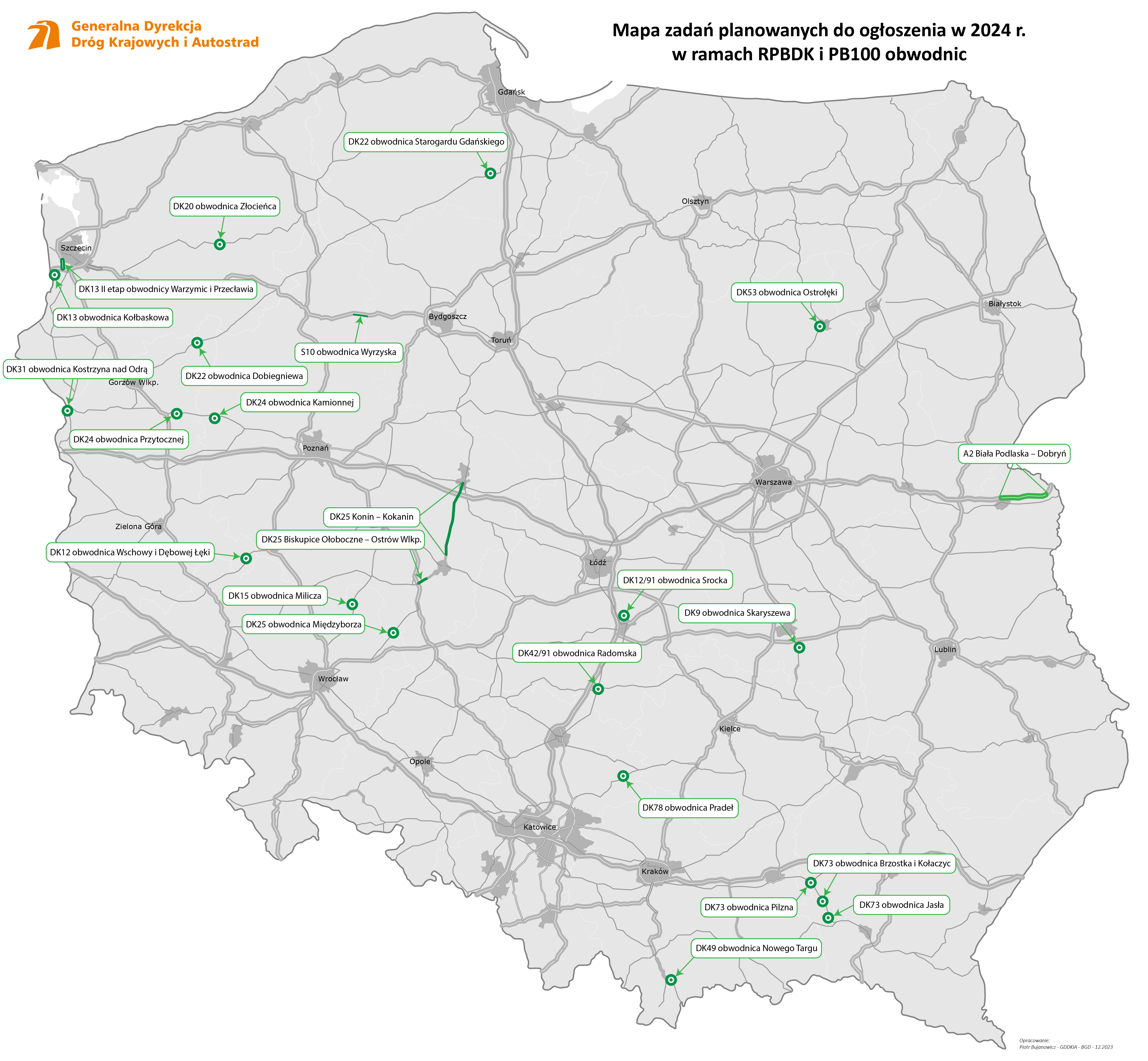 W ramach realizacji Programu budowy 100 obwodnic planujemy w 2024 roku ogłosić przetargi na 14 takich inwestycji o łącznej długości ponad 122 km. Najdłuższe z nich to obwodnice: Starogardu Gdańskiego, Ostrołęki, Brzostka i Kołaczyc (ta ostatnia połączy się z obwodnicą Jasła).