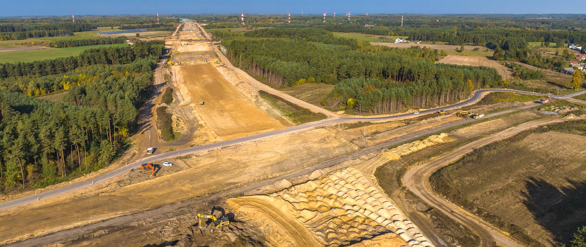 Widok z lotu ptaka na budowę autostrady A2. Słoneczny dzień, widać już zarys przyszłej drogi.