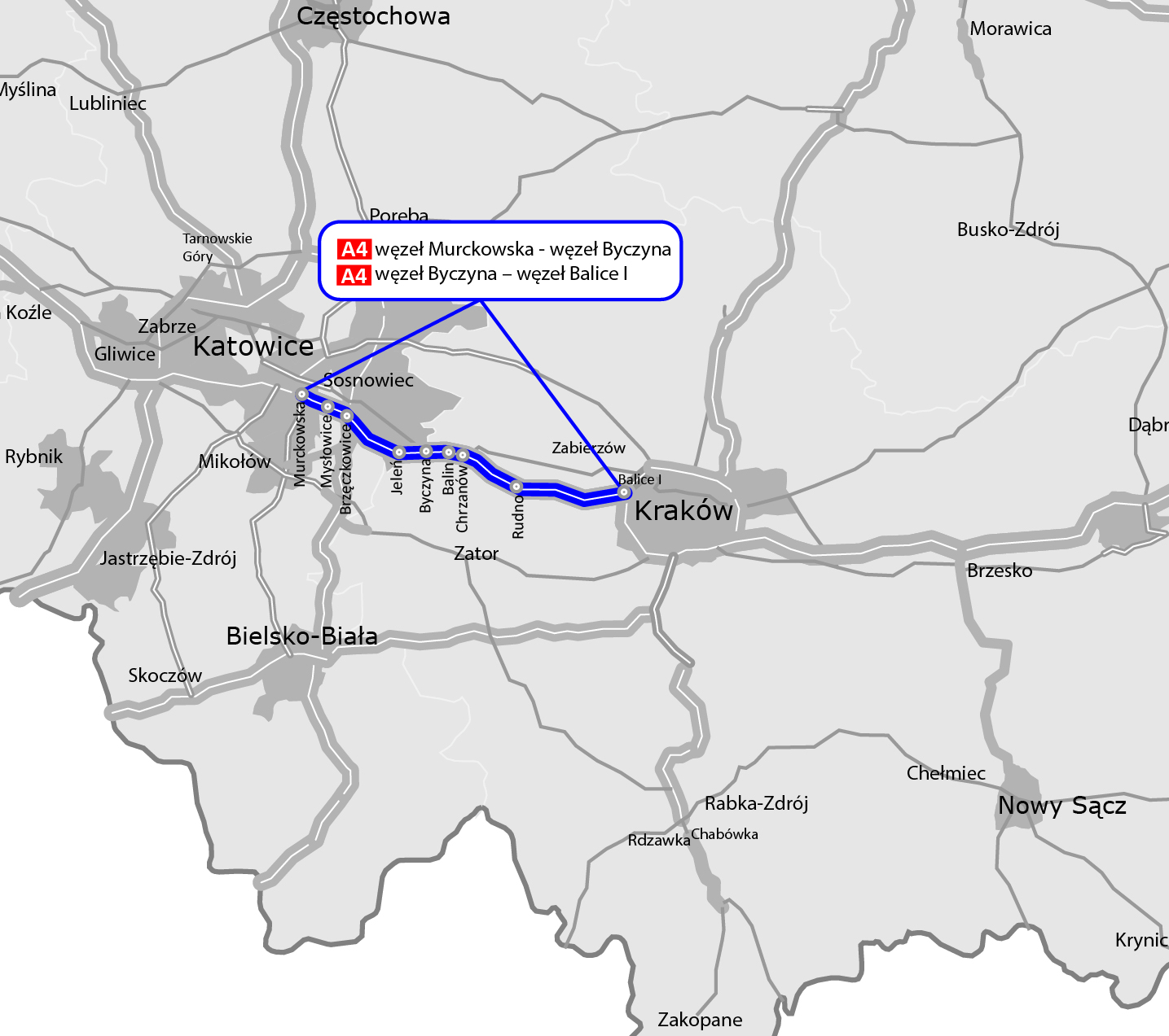 W 2027 roku kończy się koncesja spółki Stalexport Autostrada Małopolska na eksploatację i utrzymanie odcinka autostrady A4 pomiędzy węzłami Katowice Murckowska i Balice. GDDKiA przygotowuje się do ogłoszenia przetargu na opracowanie dokumentacji niezbędnej do przebudowy i rozbudowy tego odcinka. Minister Infrastruktury Andrzej Adamczyk podpisał Programy Inwestycji, pozwalające na sfinansowanie prac na odcinku pomiędzy węzłami Murckowska i Balice I.