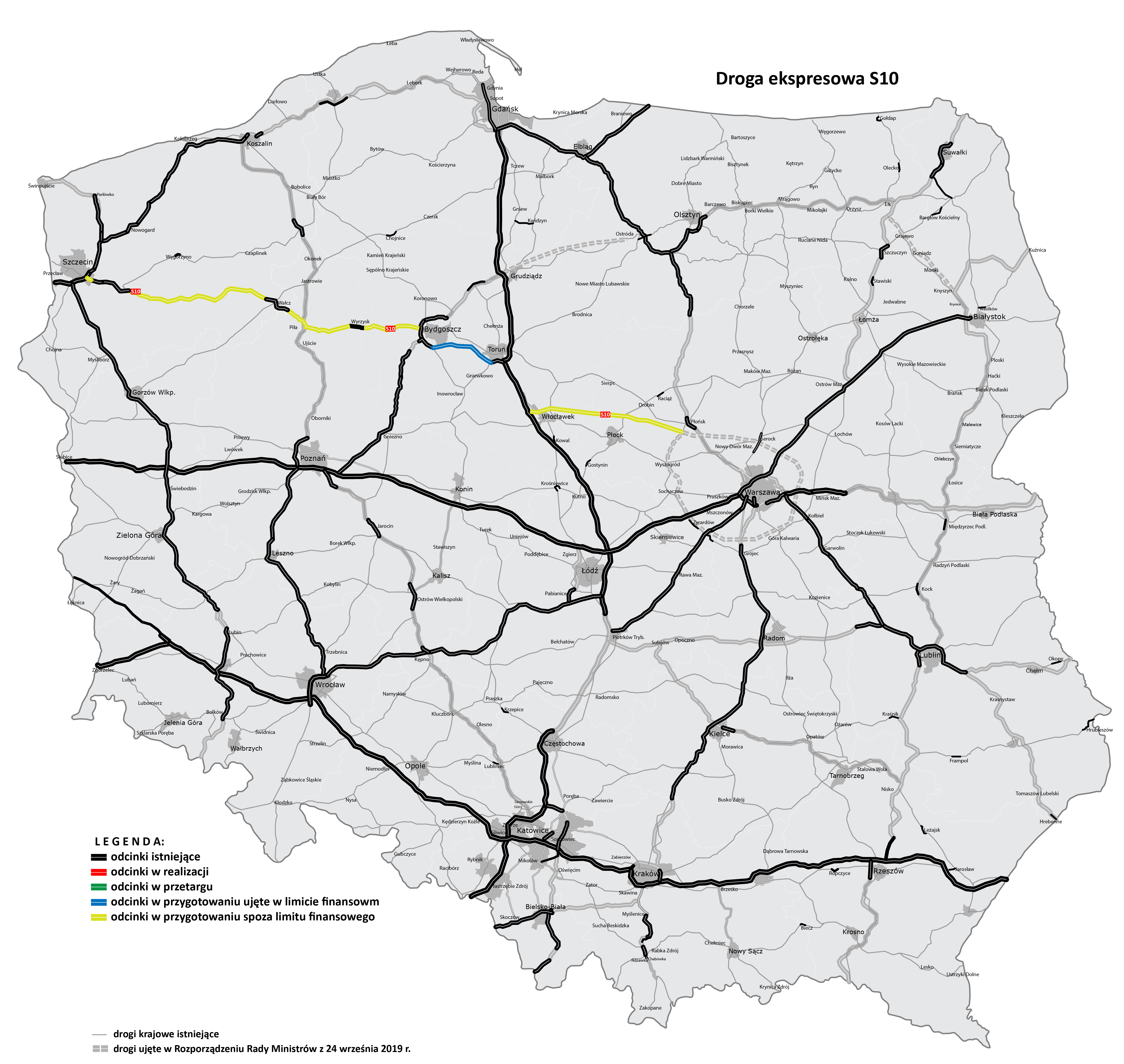 Pierwsze fragmenty S10, o łącznej długości ok. 63 km, już powstały. Większość trasy pomiędzy Szczecinem i Toruniem jest na etapie opracowywania dokumentacji do złożenia wniosku o wydanie decyzji o środowiskowych uwarunkowaniach (DŚU) lub w trakcie jej procedowania. Dla odcinka od Torunia do połączenia z Obwodnicą Aglomeracyjną Warszawy opracowano Studium korytarzowe z wstępnymi, możliwymi wariantami poprowadzenia trasy. Poniżej opisujemy stan zawansowania przyszłej drogi ekspresowej S10.