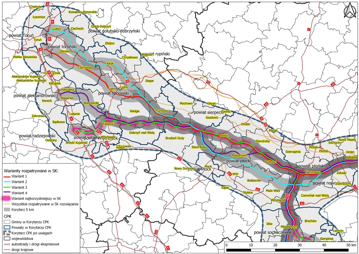 Zaproponowane zostały cztery warianty korytarzy dla planowanej trasy. W celu wyznaczenia najkorzystniejszego z nich, inwestycja została podzielona na pięć odcinków decyzyjnych. Dwa pierwsze, stanowiące ciąg drogi ekspresowej S10, zostały omówione podczas pierwszego dnia spotkań z samorządami. Drugiego dnia przedstawiliśmy trzeci i piąty odcinek decyzyjny w ciągu drogi ekspresowej S50, a trzeciego dnia odcinek czwarty w ciągu autostrady A50.