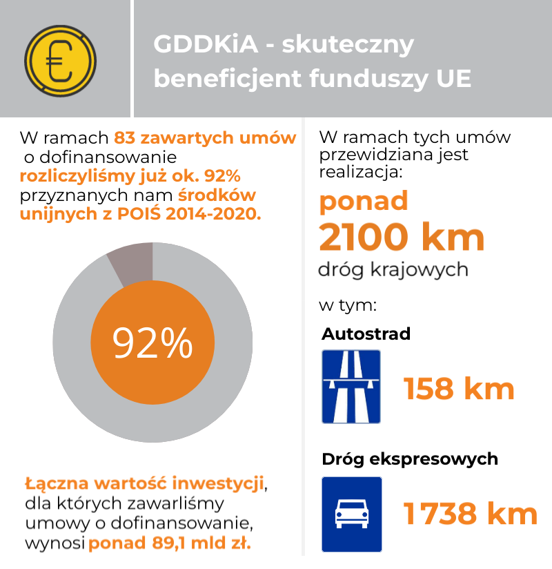 Generalna Dyrekcja Dróg Krajowych i Autostrad jest największym beneficjentem Programu Operacyjnego Infrastruktura i Środowisko na lata 2014-2020 (POIiŚ). Kwota przyznanego dla GDDKiA dofinansowania w perspektywie UE 2014 – 2020 dla wszystkich projektów GDDKiA wynosi ponad 43 mld zł. Skutecznie wykorzystujemy przyznane nam środki - rozliczyliśmy ich już ponad 92 proc.