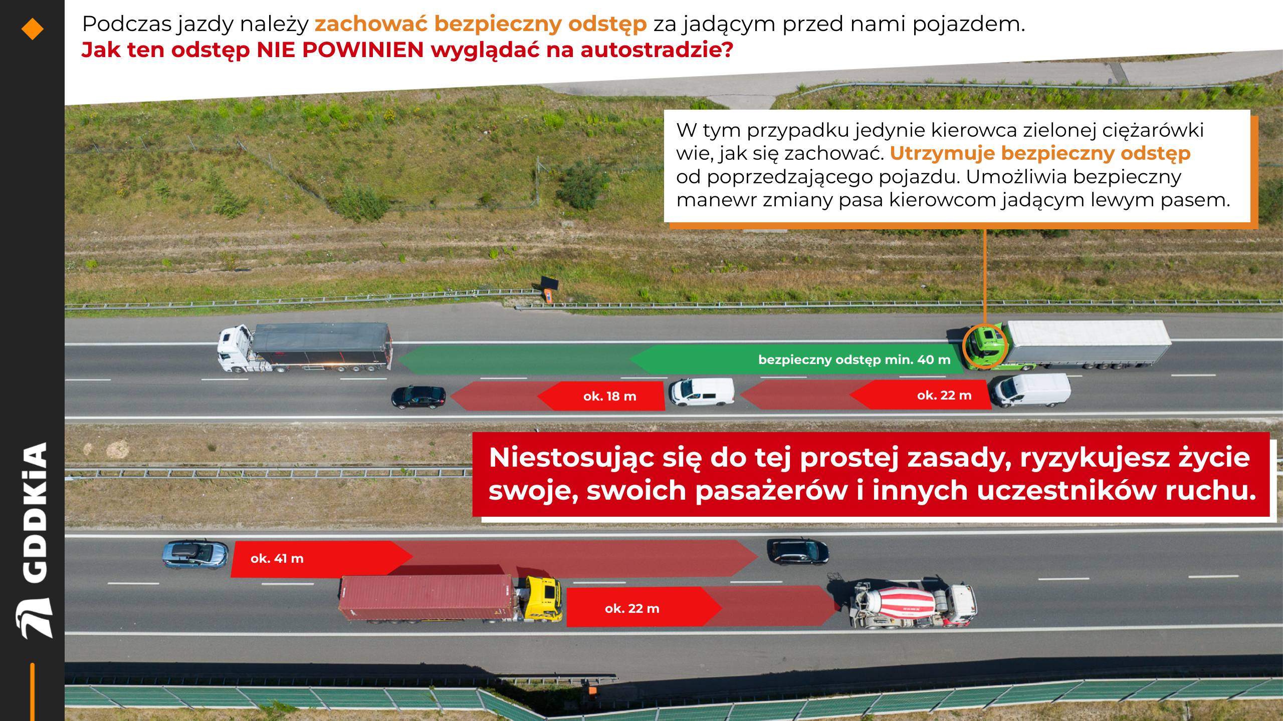 Pamiętaj! Nie stosując się do utrzymania bezpiecznej odległości od poprzedzającego pojazdu, narażasz na niebezpieczeństwo siebie, swoich bliskich oraz innych uczestników ruchu drogowego. Bezpieczeństwo na drodze w dużej mierze zależy od nas samych.