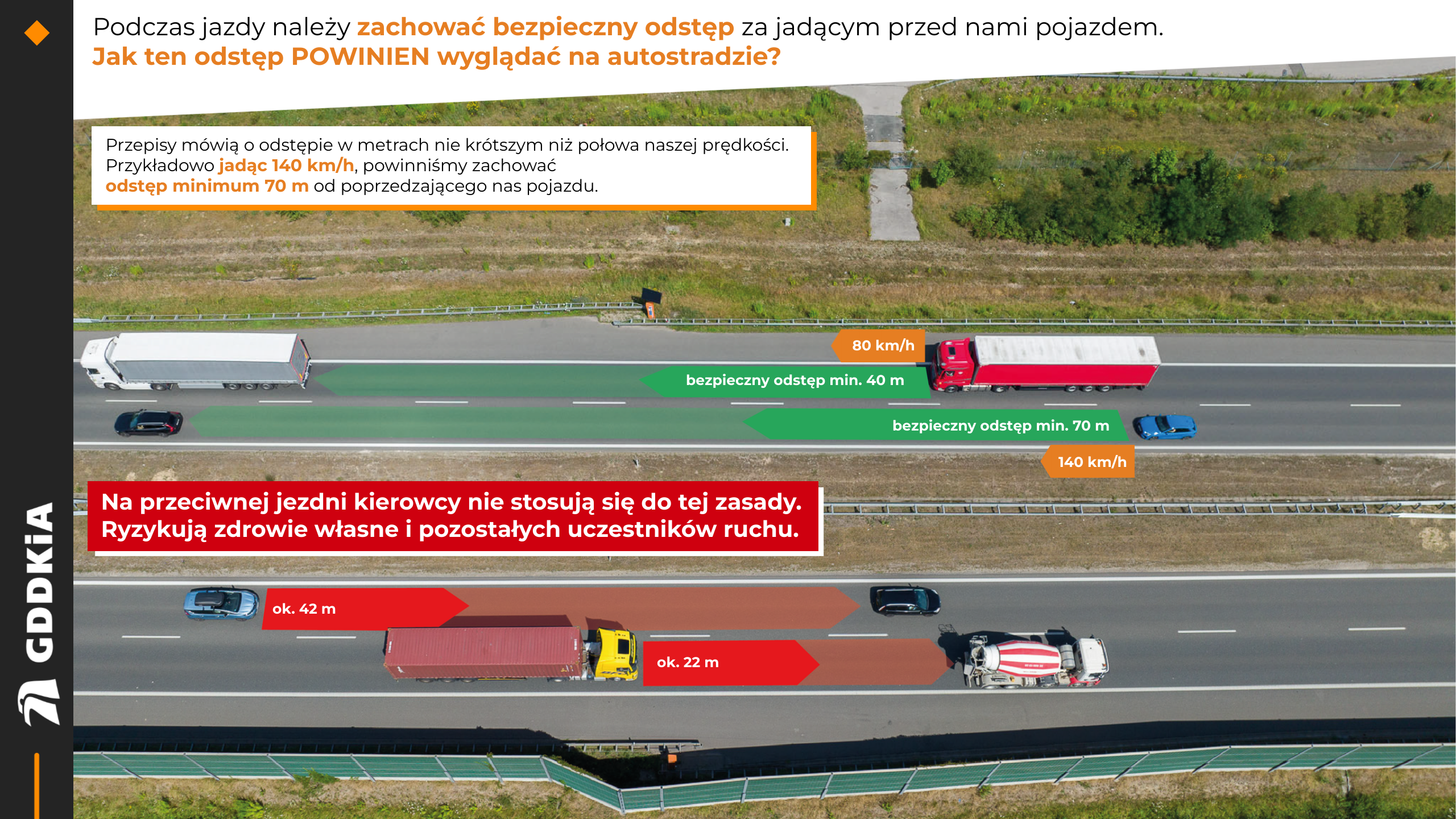Przypomnijmy, że zgodnie z obowiązującymi przepisami, bezpieczna odległość między pojazdami na drogach szybkiego ruchu (autostradach i drogach ekspresowych) wynosi połowę aktualnej prędkości. Kierowca jadący 100 km/h musi jechać co najmniej 50 m za poprzedzającym samochodem, 120 km/h - 60 m, 140 km/h - 70 m. Podobne rozwiązania obowiązują w wielu europejskich państwach, w tym m.in. w Niemczech.