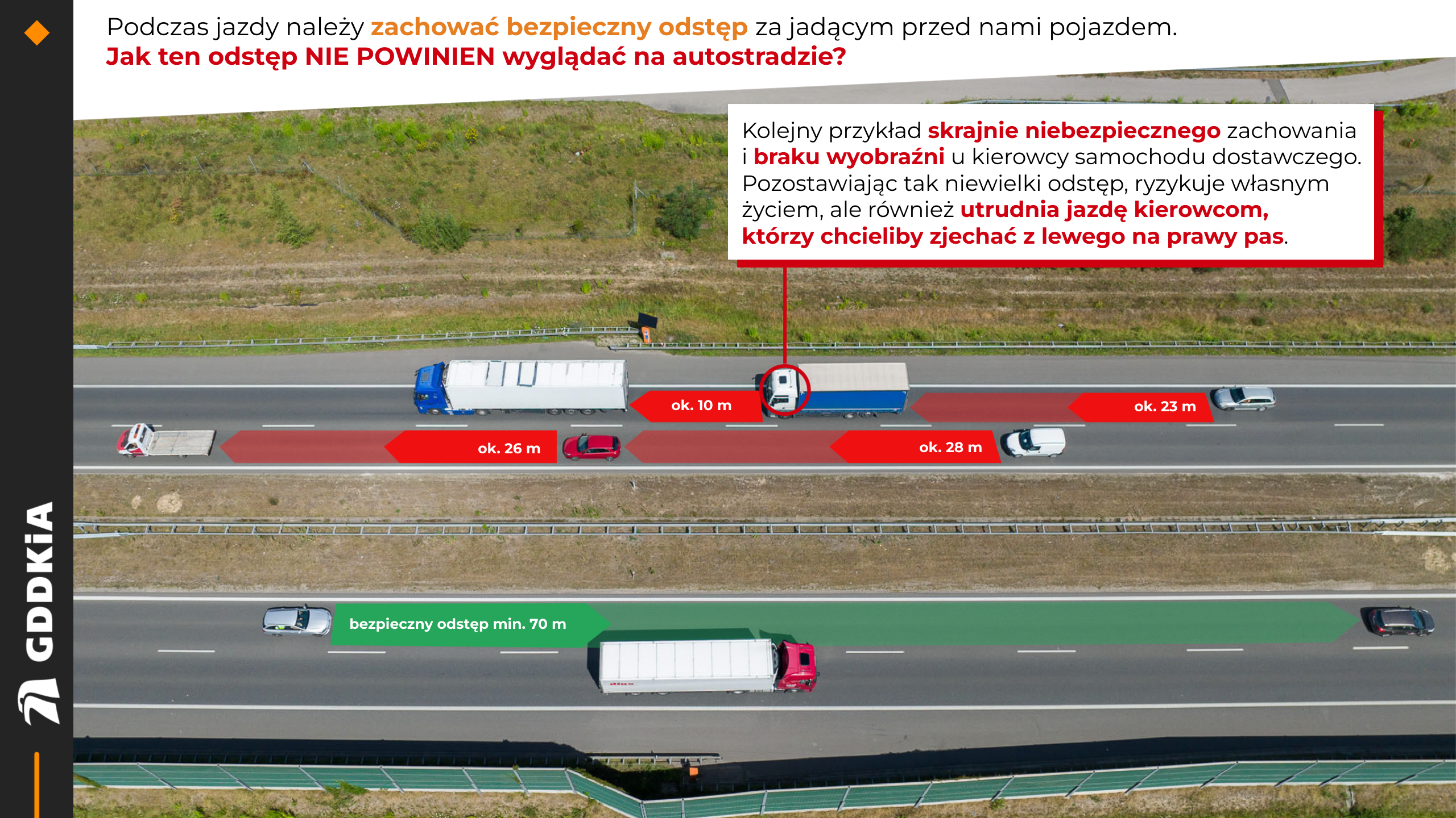 Niezachowanie bezpiecznej odległości między pojazdami na drogach szybkiego ruchu nadal jest jedną z głównych przyczyn zdarzeń i wypadków drogowych. Wciąż widzimy kierowców jadących „na zderzaku” lub w niewielkiej odległości za poprzedzającym pojazdem. I nie dotyczy to wyłącznie jazdy za autami poruszającymi się z prędkością poniżej dopuszczalnego limitu na drodze ekspresowej lub autostradzie. Bardzo często łamiący przepisy wywierają w ten sposób presję na jadących przepisowo, aby zjechali na sąsiedni pas ruchu. W sieci pełno jest filmów „dokumentujących” naganne zachowania takich kierowców.