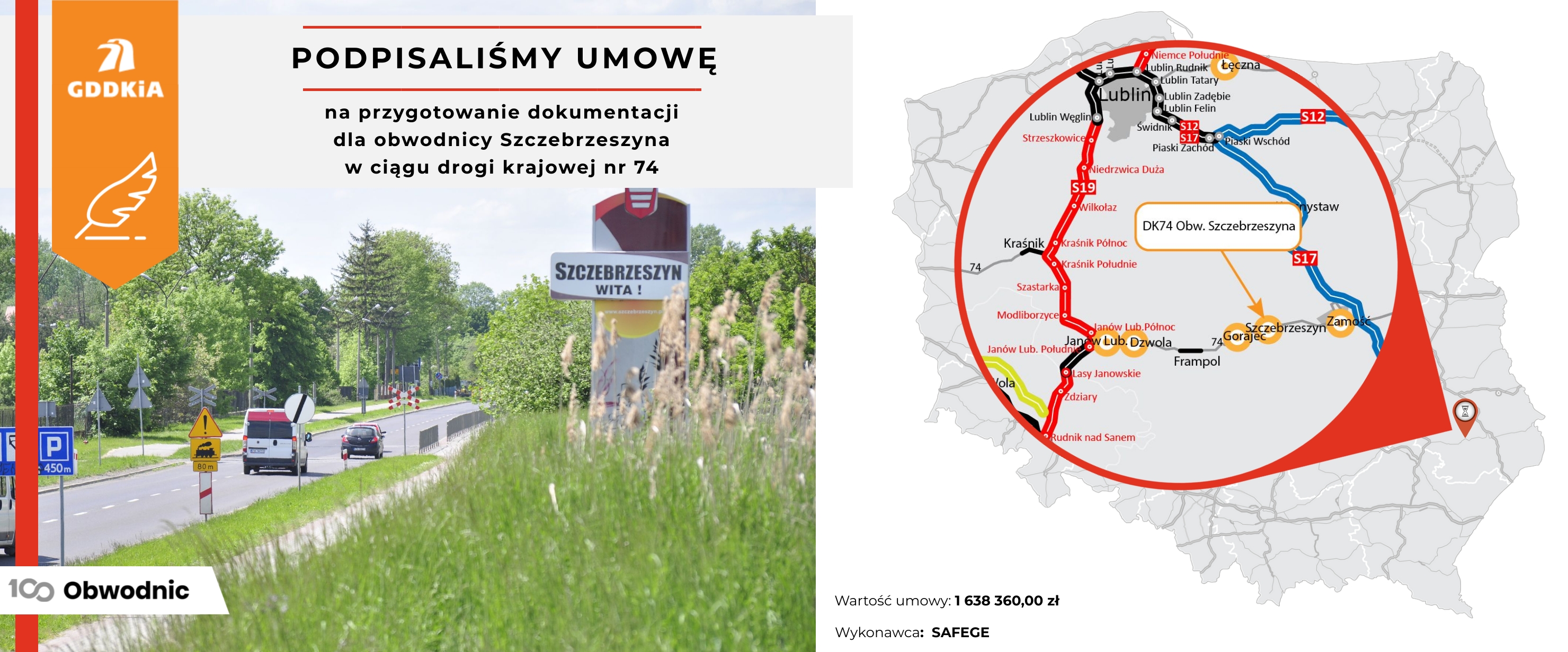 Podpisaliśmy umowę na wykonanie Studium techniczno-ekonomiczno-środowiskowego z elementami koncepcji programowej (STEŚ-R) wraz z materiałami do uzyskania decyzji o środowiskowych uwarunkowaniach (DŚU) dla obwodnicy Szczebrzeszyna w ciągu drogi krajowej nr 74. Droga powstanie w ramach rządowego Programu budowy 100 obwodnic.
