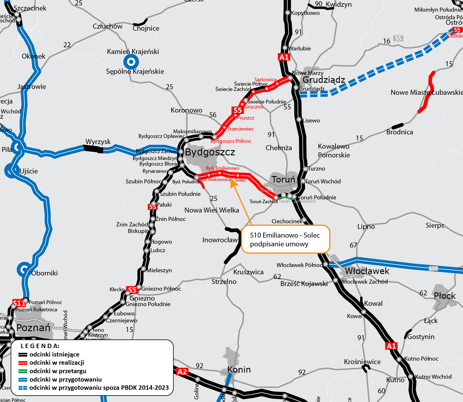 Podpisując 6 maja br. umowy na projekt i budowę rozpoczęliśmy realizację dwóch odcinków S10. Bydgoszcz Południe - Emilianowo wraz z rozbudową drogi krajowej nr 25 oraz Solec - Toruń Zachód, o łącznej długości 30 kilometrów. Wartość obu kontraktów to ponad 836 mln zł. Wykonawcy obu odcinków rozpoczęli inwentaryzację przyrodniczą i prace projektowe. Dziś podpisana umowa oznacza rozpoczęcie prac na znajdującym się pomiędzy nimi odc. Emilianowo - Solec.