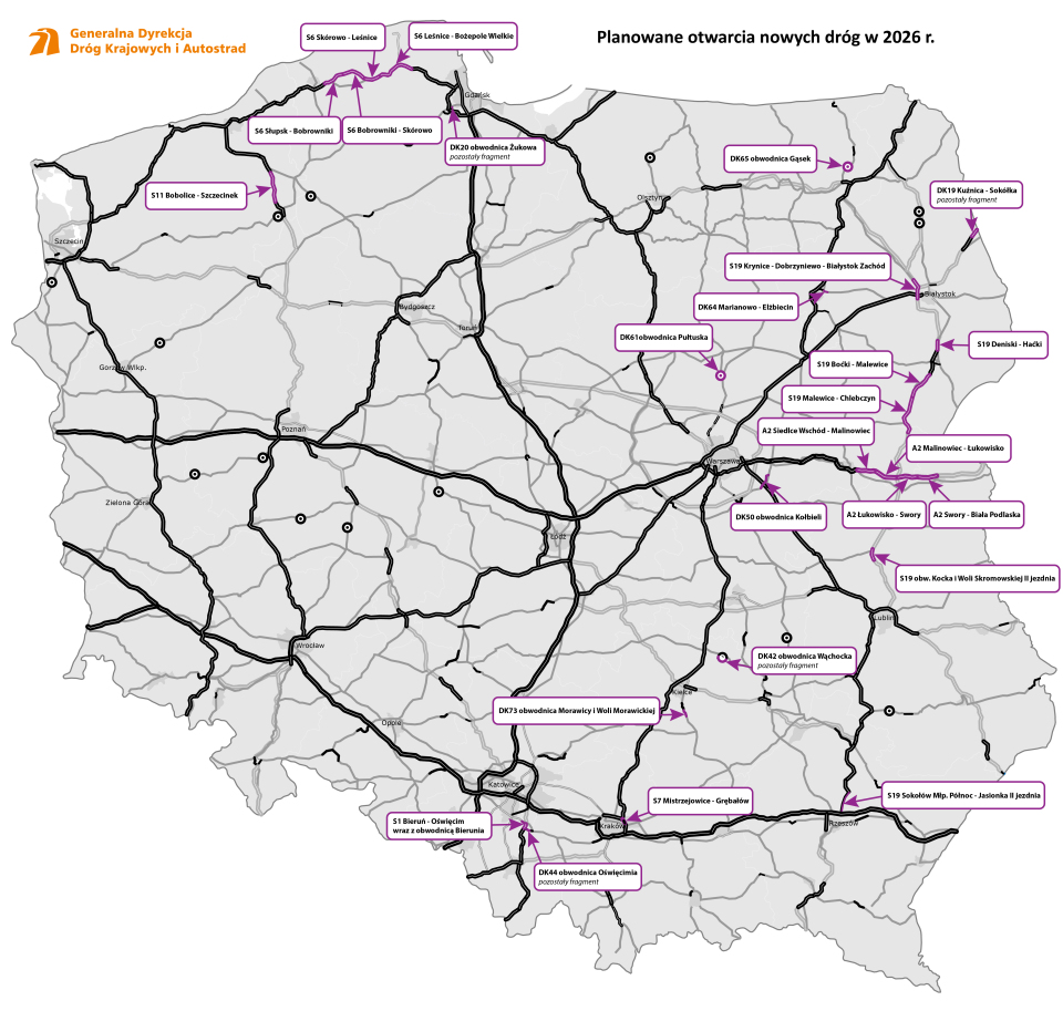 Połączenie drogą ekspresową Szczecina z Gdańskiem, domknięcie IV obwodnicy Krakowa, a także finalizacja kolejnych fragmentów międzynarodowego szlaku Via Carpatia - przyszły rok zapowiada się nie mniej ciekawie, jak ten mijający. Dzięki oddaniu nowych odcinków już w I kwartale 2026 r. przekroczymy granicę 5,5 tys. km tras szybkiego ruchu w Polsce!