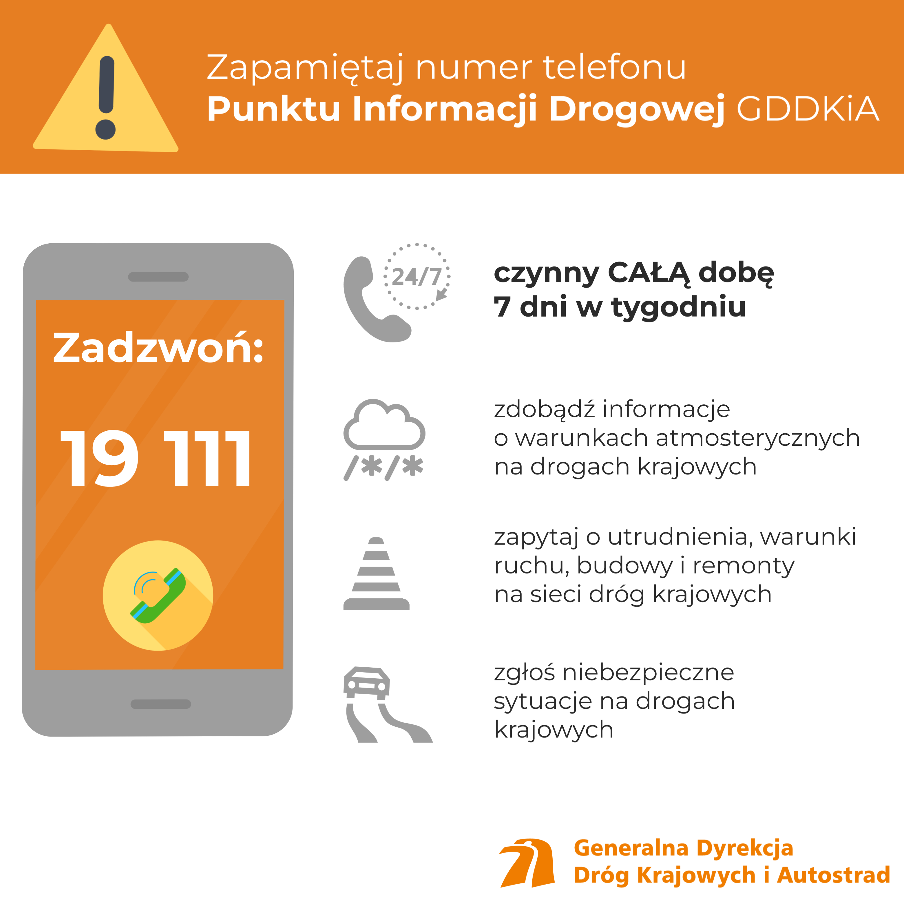 Kolejnym źródłem informacji dla wszystkich planujących podróż po drogach krajowych jest numer ogólnopolskiej Informacji Drogowej 19 111. Jest on czynny 24 godziny na dobę, 7 dni w tygodniu.