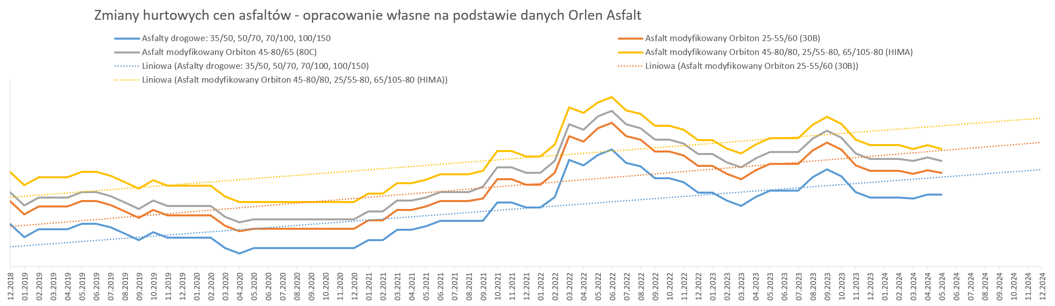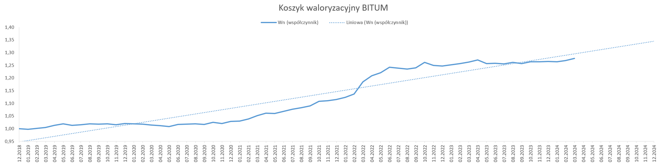 Od stycznia 2019 r. do marca 2024 r., w oparciu o dostępne dane opublikowane przez GUS, wskaźnik korygujący ceny dla nawierzchni bitumicznej wyniósł 1,2761, natomiast dla nawierzchni betonowej 1,2709. Biorąc pod uwagę rynkowe ceny i dane GUS, należy uznać, że wyliczone w oparciu o mechanizm waloryzacyjny wskaźniki, oddają realny obraz zmian cen na rynku. Dane sprzed roku można zobaczyć w komunikacie na naszej stronie internetowej.