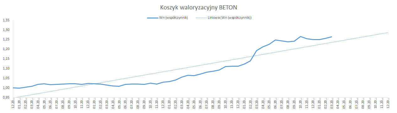 W skład „koszyka”, składającego się z głównych elementów cenotwórczych wpływających na ostateczny bilans kosztowy kontraktu, wchodzą ceny produkcyjne: paliwa, cementu, asfaltu, stali, kruszywa oraz średnie wynagrodzenia pracowników branży (wszystkie z ustalonymi stałymi wagami).