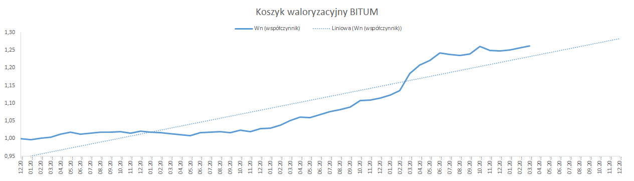 Od stycznia 2019 r. do marca 2023 r., w oparciu o dostępne dane opublikowane przez GUS, wskaźnik korygujący ceny dla nawierzchni bitumicznej wyniósł 1,2623, natomiast dla nawierzchni betonowej 1,2636. Biorąc pod uwagę rynkowe ceny i dane GUS, należy uznać, że wyliczone w oparciu o mechanizm waloryzacyjny wskaźniki, oddają realny obraz zmian cen na rynku.
