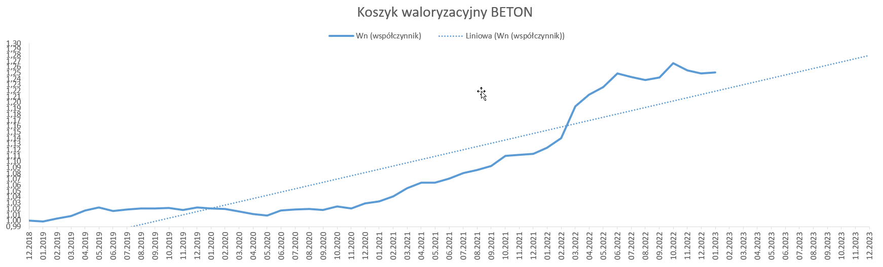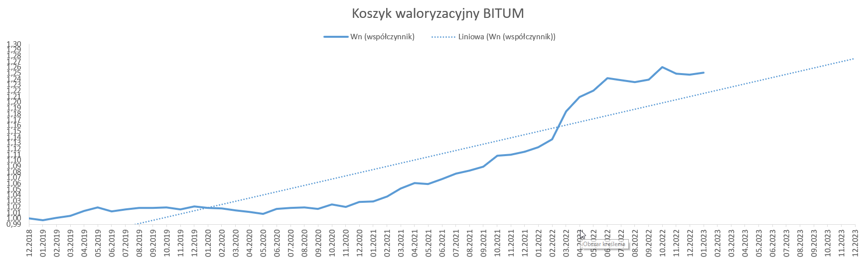 Wskaźniki waloryzacyjne dla obu koszyków (bitum i beton) w styczniu 2023 r. zanotowały minimalne wzrosty (patrz wykresy poniżej).