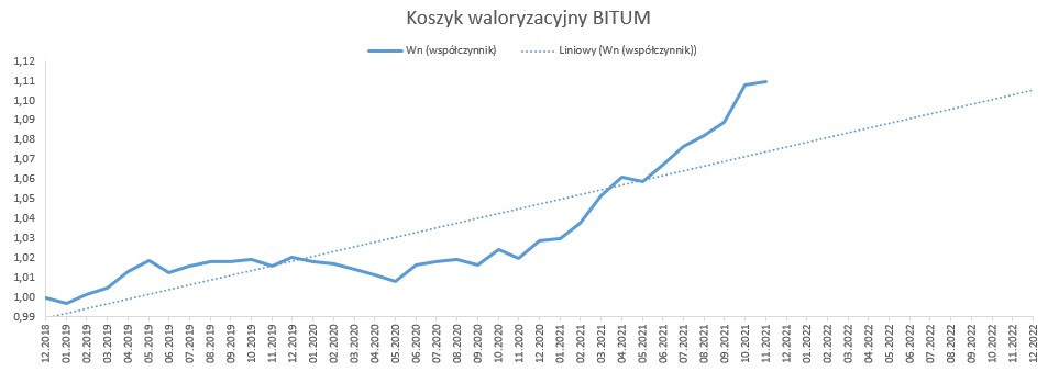 Od stycznia 2019 r. do listopada 2021 r., w oparciu o dostępne dane opublikowane przez GUS, wskaźnik korygujący ceny dla nawierzchni bitumicznej wyniósł 1,1095, natomiast dla nawierzchni betonowej 1,1117. Biorąc pod uwagę rynkowe ceny i dane GUS, należy uznać, że wyliczone w oparciu o nowy mechanizm waloryzacyjny wskaźniki, oddają realny obraz zmian cen na rynku.