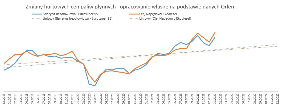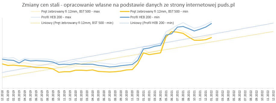 Sprawdziliśmy wskaźniki waloryzacyjne GUS w kontekście najnowszych danych rynkowych. Obserwowany od końcówki 2020 roku dynamiczny wzrost ceny stali wyhamował w III kwartale 2021 r., jednak od końca 2021 r. i w pierwszym miesiącu 2022 r. można zaobserwować już tendencję wzrostową. W styczniu 2022 r. obserwowaliśmy również wzrosty ceny paliw. Ceny asfaltów w ostatnim miesiącu pozostały bez zmian.