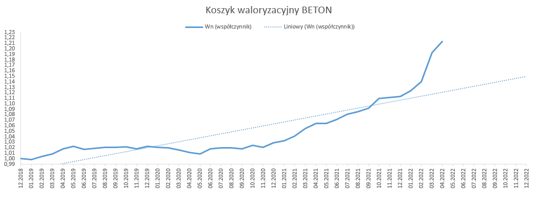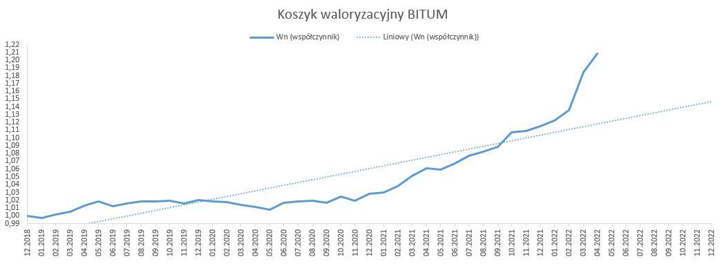 Od stycznia 2019 r. do kwietnia 2022 r., w oparciu o dostępne dane opublikowane przez GUS, wskaźnik korygujący ceny dla nawierzchni bitumicznej wyniósł 1,2087, natomiast dla nawierzchni betonowej 1,2133. Biorąc pod uwagę rynkowe ceny i dane GUS, należy uznać, że wyliczone w oparciu o mechanizm waloryzacyjny wskaźniki, oddają realny obraz zmian cen na rynku.
