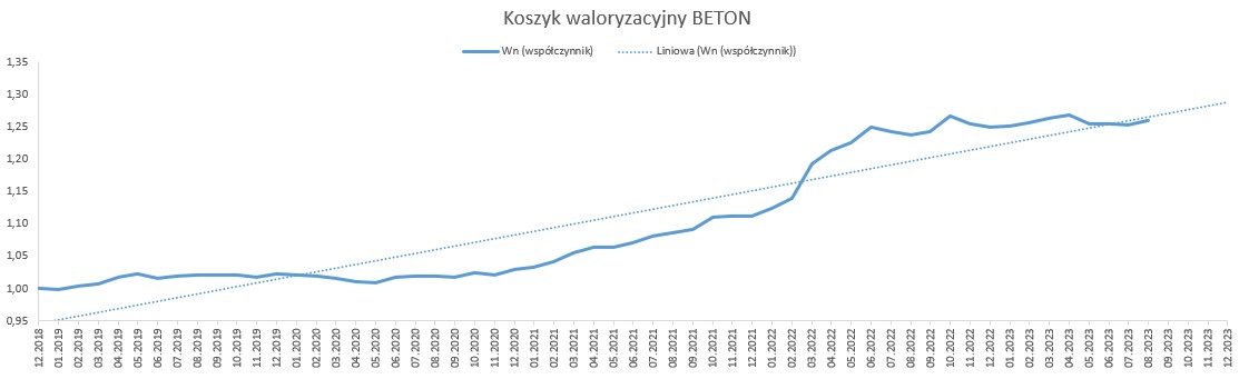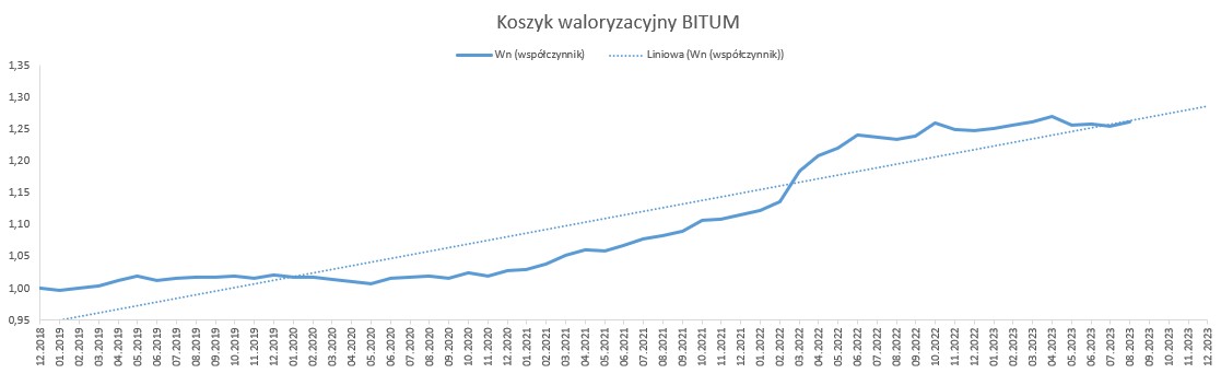 Od stycznia 2019 r. do sierpnia 2023 r., w oparciu o dostępne dane opublikowane przez GUS, wskaźnik korygujący ceny dla nawierzchni bitumicznej wyniósł 1,2614, natomiast dla nawierzchni betonowej 1,2601. Biorąc pod uwagę rynkowe ceny i dane GUS, należy uznać, że wyliczone w oparciu o mechanizm waloryzacyjny wskaźniki, oddają realny obraz zmian cen na rynku. Dane sprzed roku można zobaczyć w komunikacie na naszej stronie internetowej.