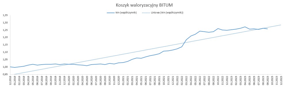 Od stycznia 2019 r. do września 2023 r., w oparciu o dostępne dane opublikowane przez GUS, wskaźnik korygujący ceny dla nawierzchni bitumicznej wyniósł 1,2568, natomiast dla nawierzchni betonowej 1,2560. Biorąc pod uwagę rynkowe ceny i dane GUS, należy uznać, że wyliczone w oparciu o mechanizm waloryzacyjny wskaźniki, oddają realny obraz zmian cen na rynku. Dane sprzed roku można zobaczyć w komunikacie na naszej stronie internetowej.