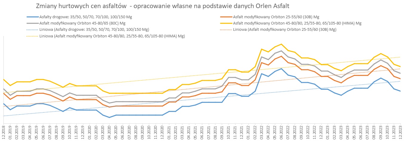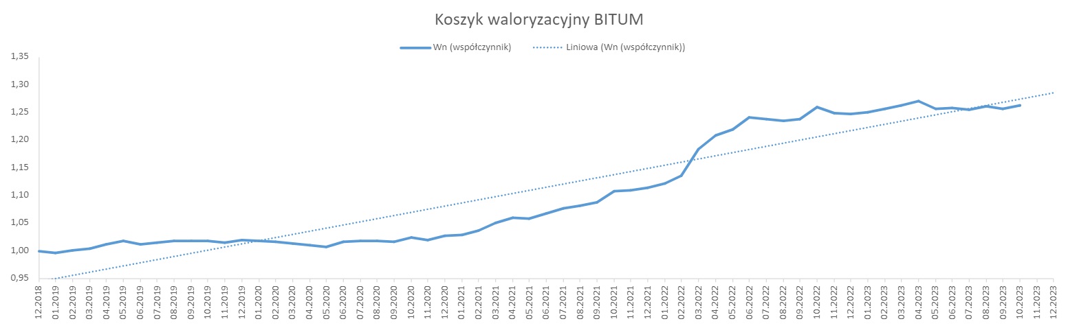 Od stycznia 2019 r. do października 2023 r., w oparciu o dostępne dane opublikowane przez GUS, wskaźnik korygujący ceny dla nawierzchni bitumicznej wyniósł 1,2634, natomiast dla nawierzchni betonowej 1,2579. Biorąc pod uwagę rynkowe ceny i dane GUS, należy uznać, że wyliczone w oparciu o mechanizm waloryzacyjny wskaźniki, oddają realny obraz zmian cen na rynku. Dane sprzed roku można zobaczyć w komunikacie na naszej stronie internetowej.