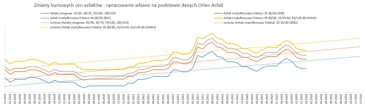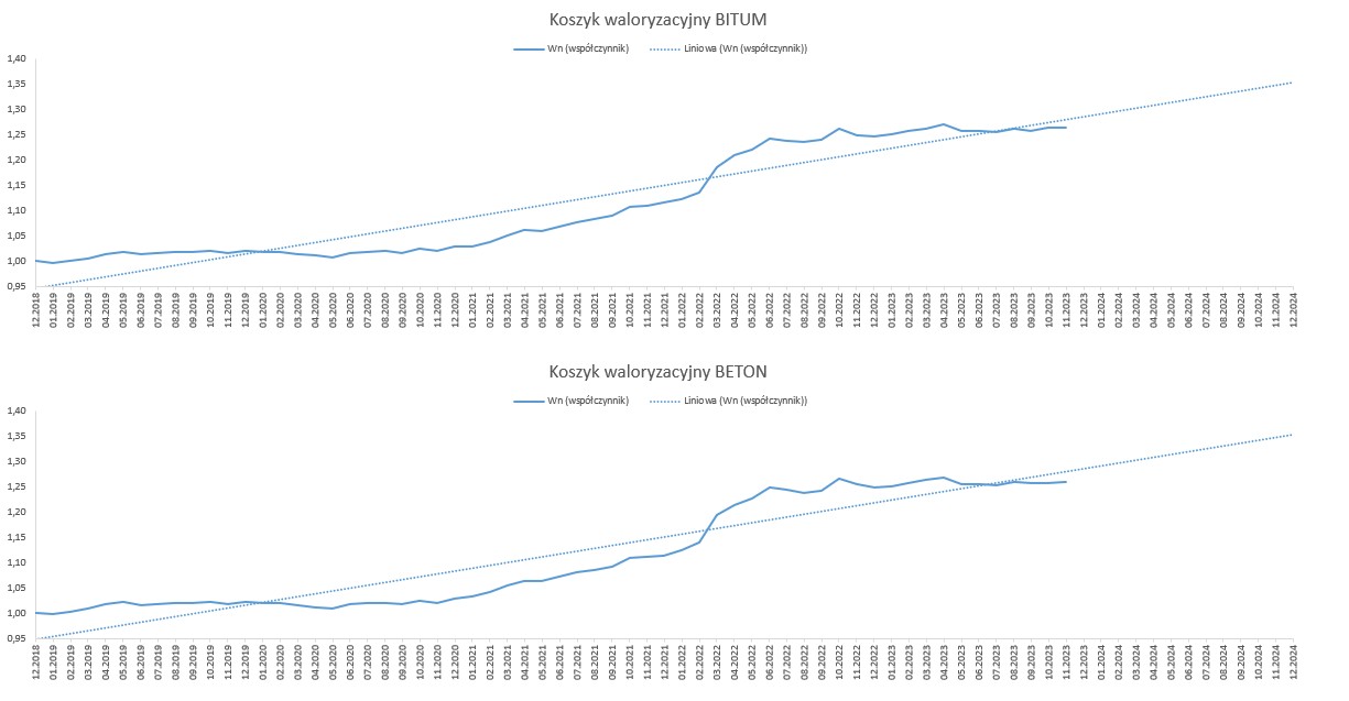 Od stycznia 2019 r. do listopada 2023 r., w oparciu o dostępne dane opublikowane przez GUS, wskaźnik korygujący ceny dla nawierzchni bitumicznej wyniósł 1,2633, natomiast dla nawierzchni betonowej 1,2596. Biorąc pod uwagę rynkowe ceny i dane GUS, należy uznać, że wyliczone w oparciu o mechanizm waloryzacyjny wskaźniki, oddają realny obraz zmian cen na rynku. Dane sprzed roku można zobaczyć w komunikacie na naszej stronie internetowej.