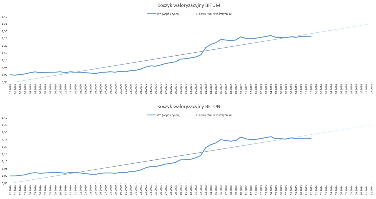 Od stycznia 2019 r. do grudnia 2023 r., w oparciu o dostępne dane opublikowane przez GUS, wskaźnik korygujący ceny dla nawierzchni bitumicznej wyniósł 1,2641, natomiast dla nawierzchni betonowej 1,2549. Biorąc pod uwagę rynkowe ceny i dane GUS, należy uznać, że wyliczone w oparciu o mechanizm waloryzacyjny wskaźniki, oddają realny obraz zmian cen na rynku. Dane sprzed roku można zobaczyć w komunikacie na naszej stronie internetowej.