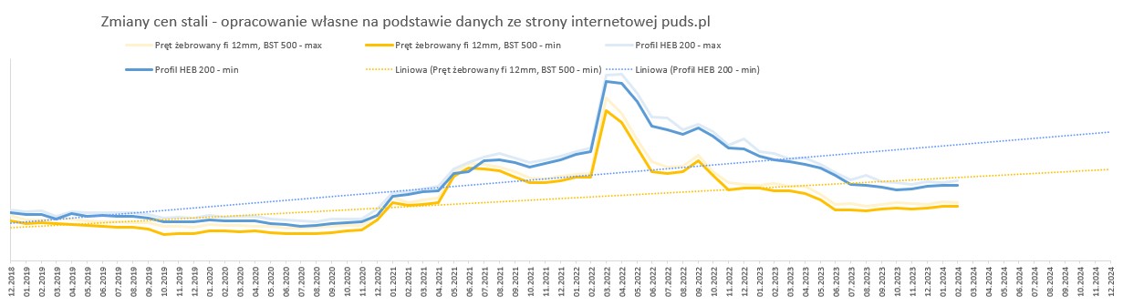 Sprawdziliśmy wskaźniki waloryzacyjne GUS w kontekście najnowszych danych rynkowych. W przypadku cen stali, asfaltów oraz paliw w lutym 2024 r. nie odnotowano większych zmian w stosunku do poprzedniego miesiąca.