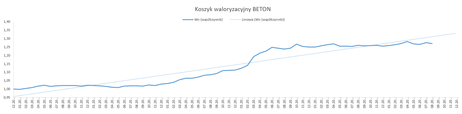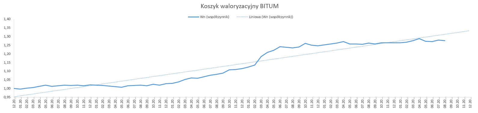 Od stycznia 2019 r. do sierpnia 2024 r., w oparciu o dostępne dane opublikowane przez GUS, wskaźnik korygujący ceny dla nawierzchni bitumicznej wyniósł 1,2767, natomiast dla nawierzchni betonowej 1,2704.