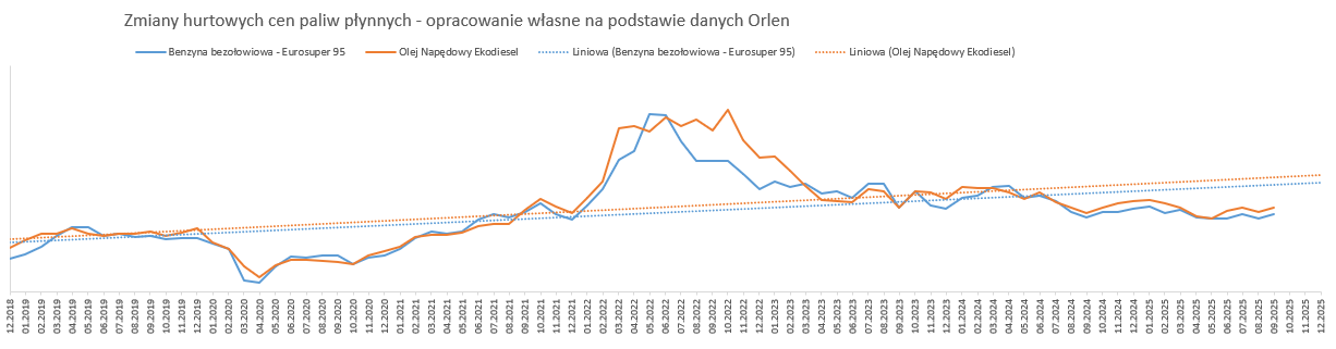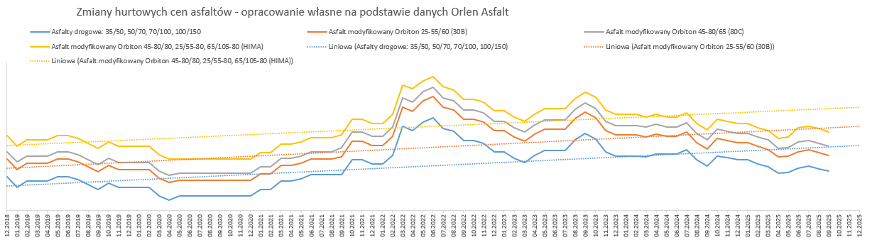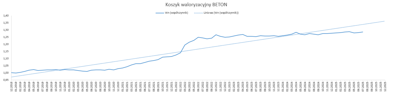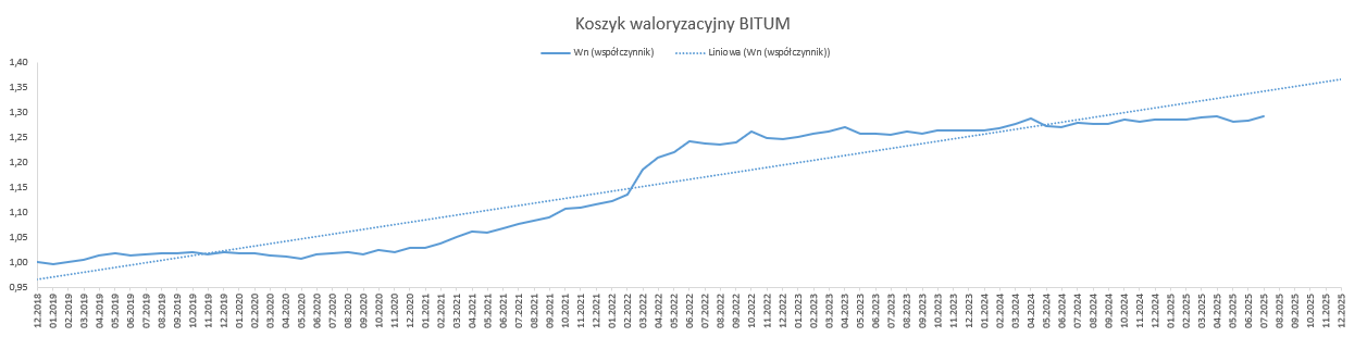 Od stycznia 2019 r. do lipca 2025 r., w oparciu o dostępne dane opublikowane przez GUS, wskaźnik korygujący ceny dla nawierzchni bitumicznej wyniósł 1,2915, natomiast dla nawierzchni betonowej 1,2852.
