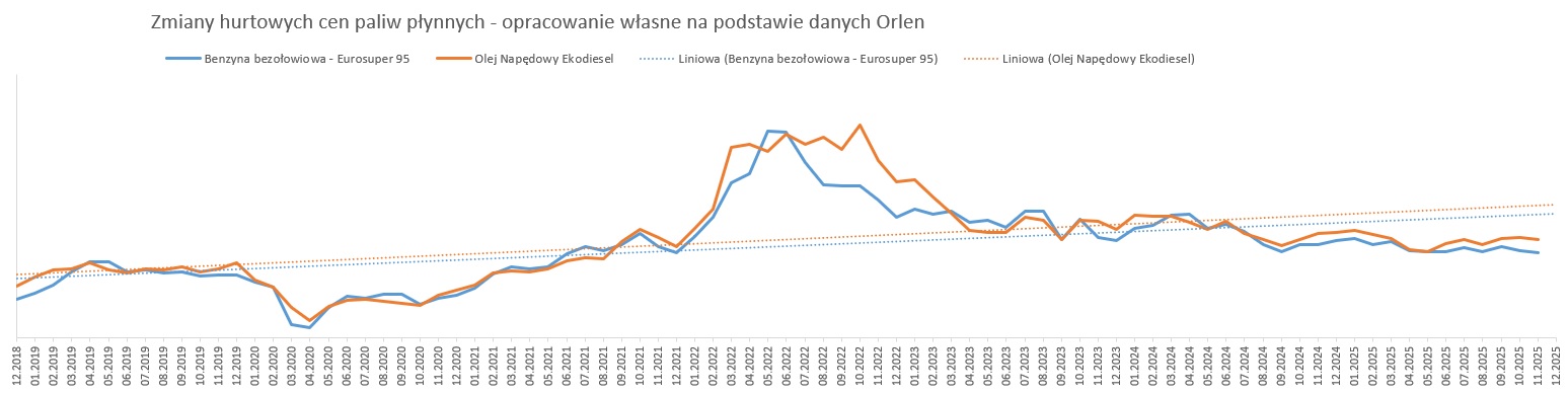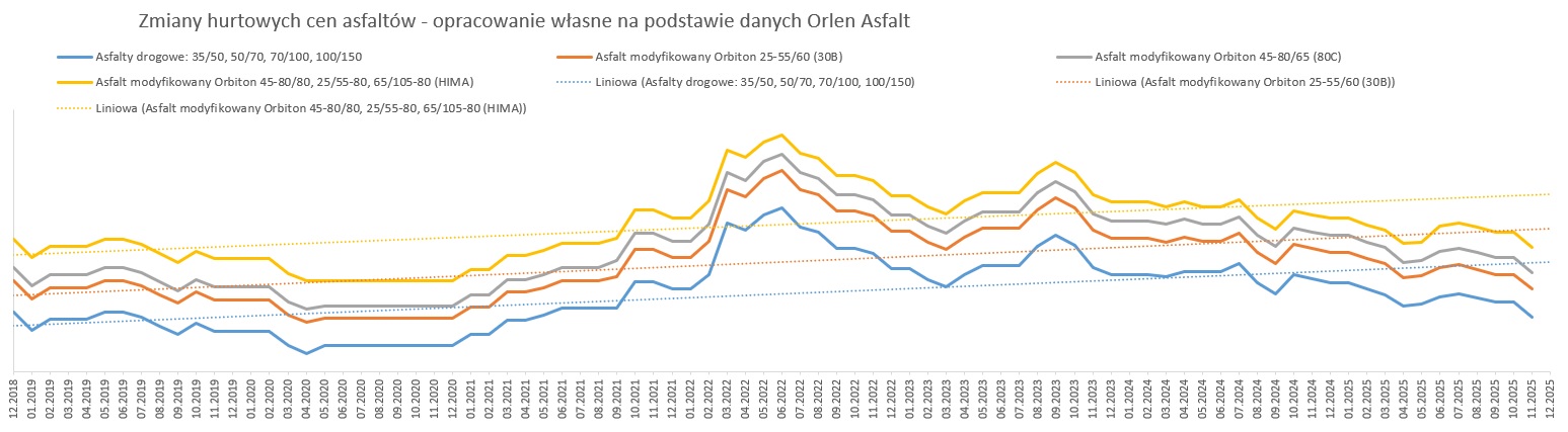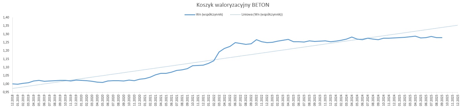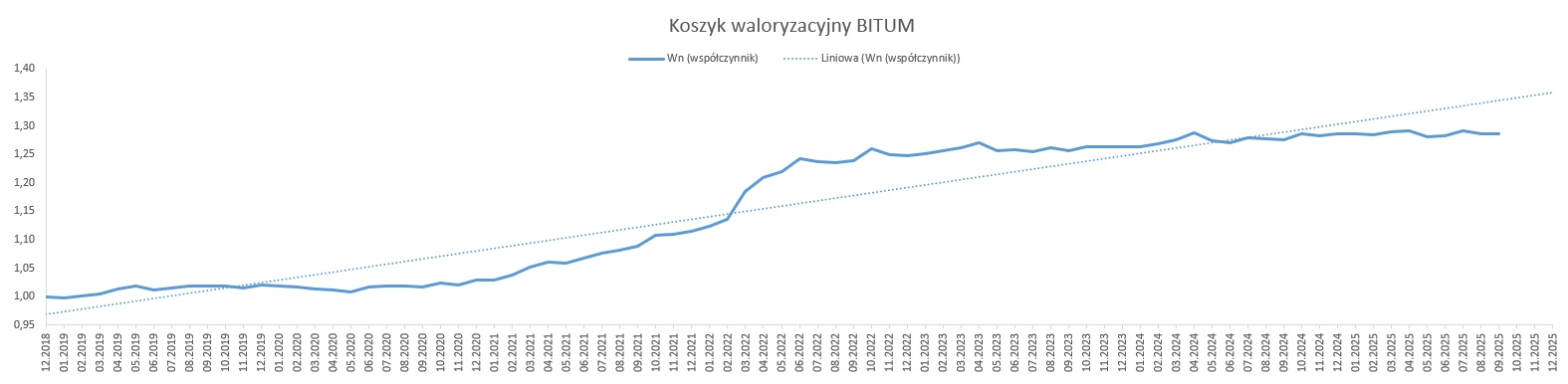 Od stycznia 2019 r. do września 2025 r., w oparciu o dostępne dane opublikowane przez GUS, wskaźnik korygujący ceny dla nawierzchni bitumicznej wyniósł 1,2866, natomiast dla nawierzchni betonowej 1,2796.