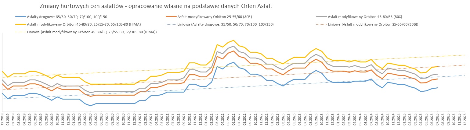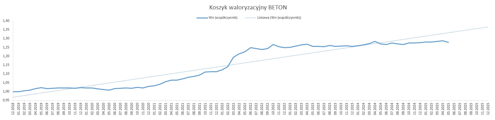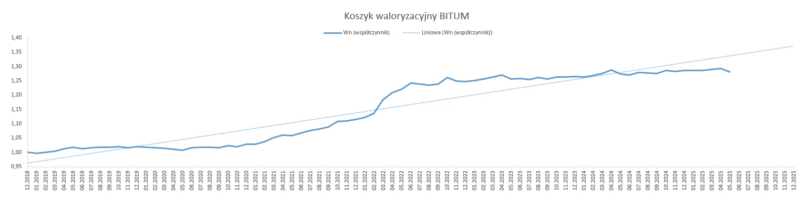 Od stycznia 2019 r. do maja 2025 r., w oparciu o dostępne dane opublikowane przez GUS, wskaźnik korygujący ceny dla nawierzchni bitumicznej wyniósł 1,2810, natomiast dla nawierzchni betonowej 1,2778.