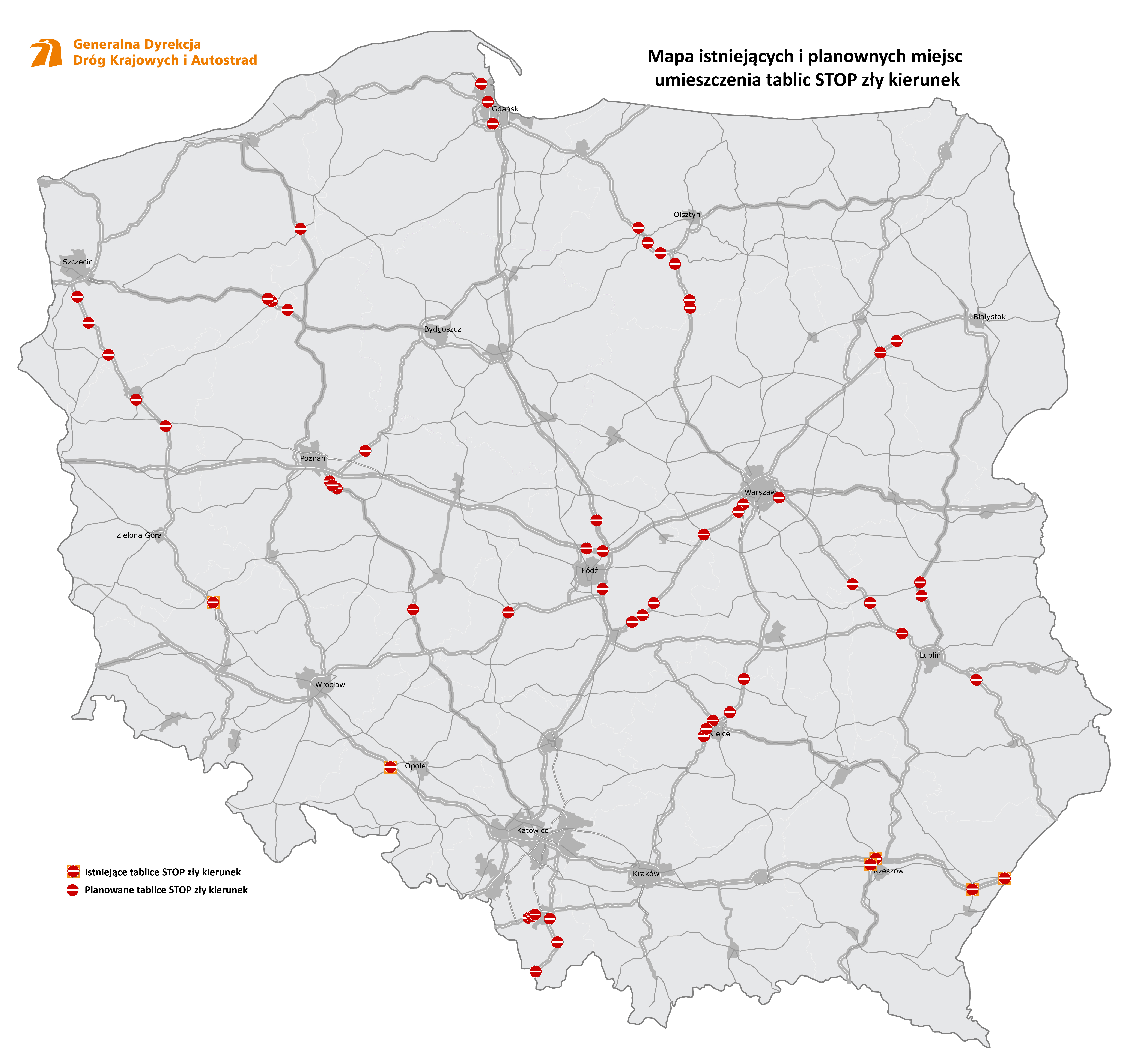 Charakterystyczne duże żółte tablice z napisem „STOP Zły kierunek” i symbolem dłoni z umieszczonym na niej piktogramem znaku zakaz wjazdu, ustawiliśmy już w siedmiu lokalizacjach przy autostradzie A4 na węzłach Opole Zachód, Rzeszów Północ i Przemyśl oraz przed granicą Polski z Ukrainą w Korczowej. Do tego również na łącznicy węzła Głogów Południe na drodze ekspresowej S3 oraz w dwóch punktach na węźle Świlcza na S19.