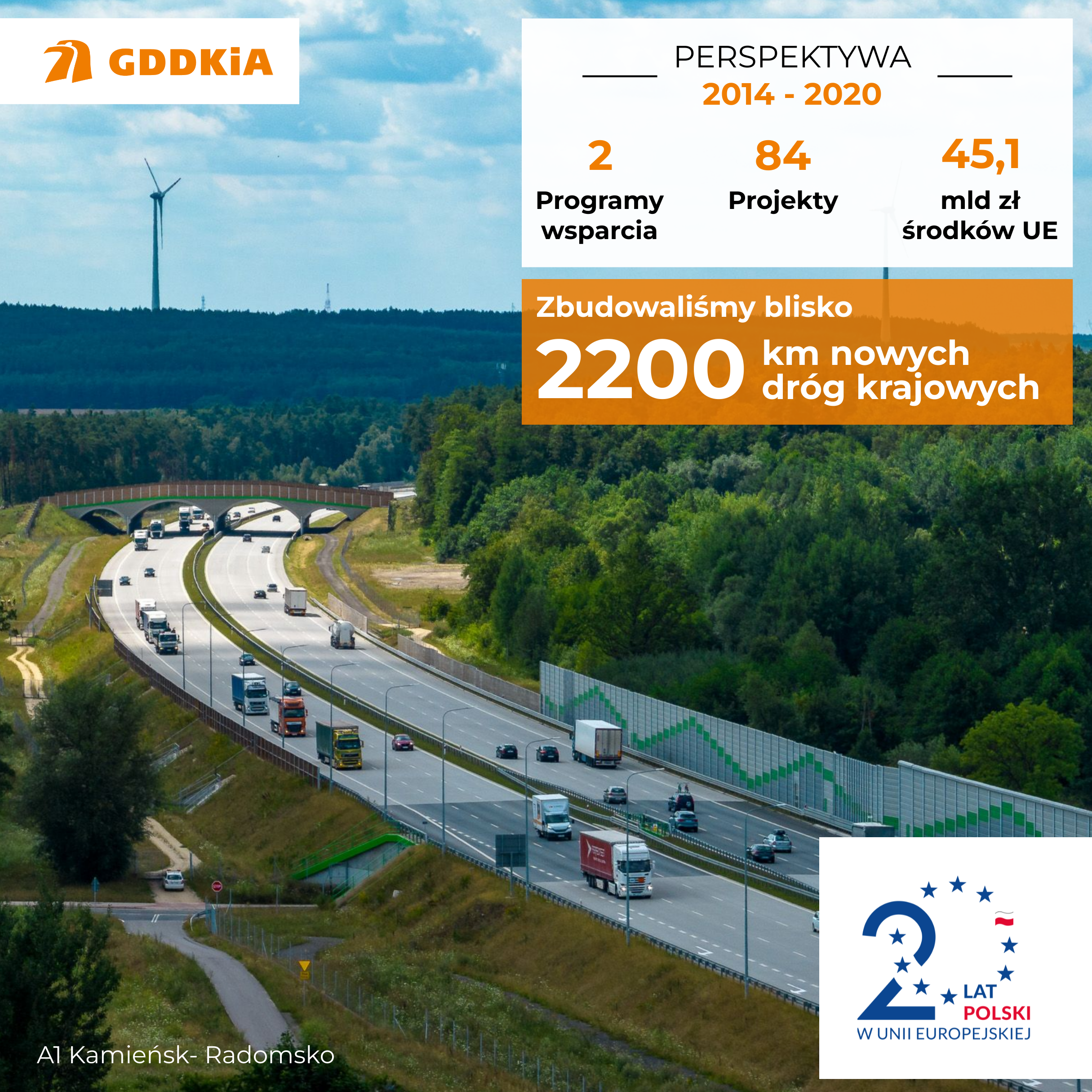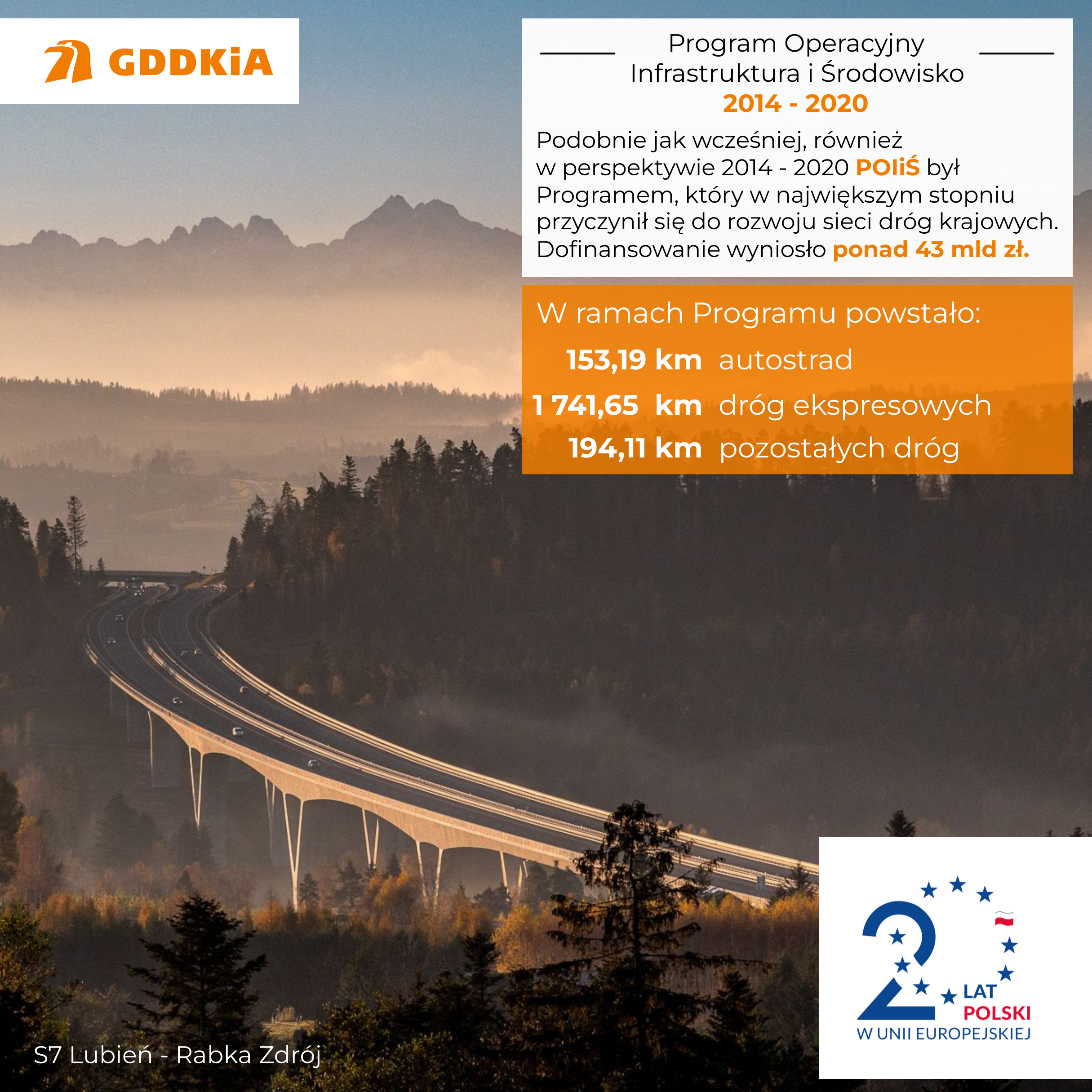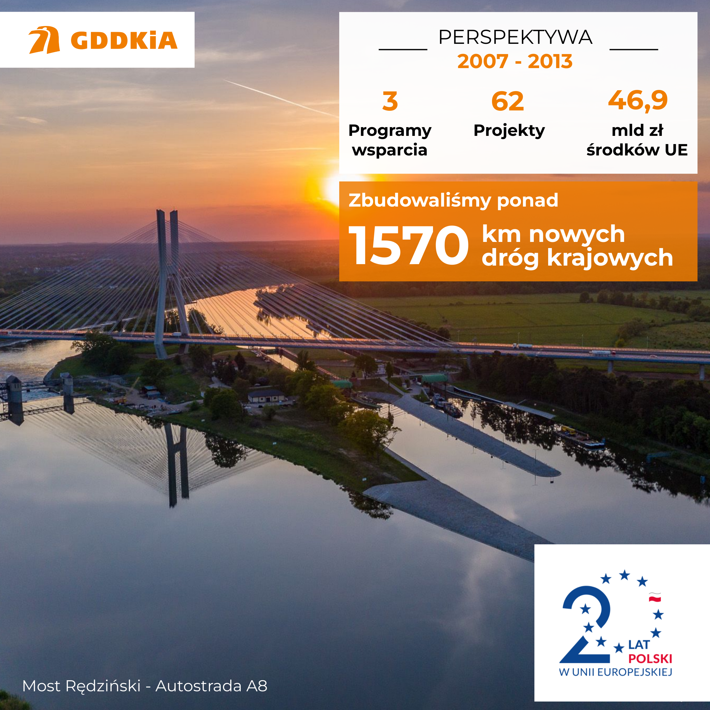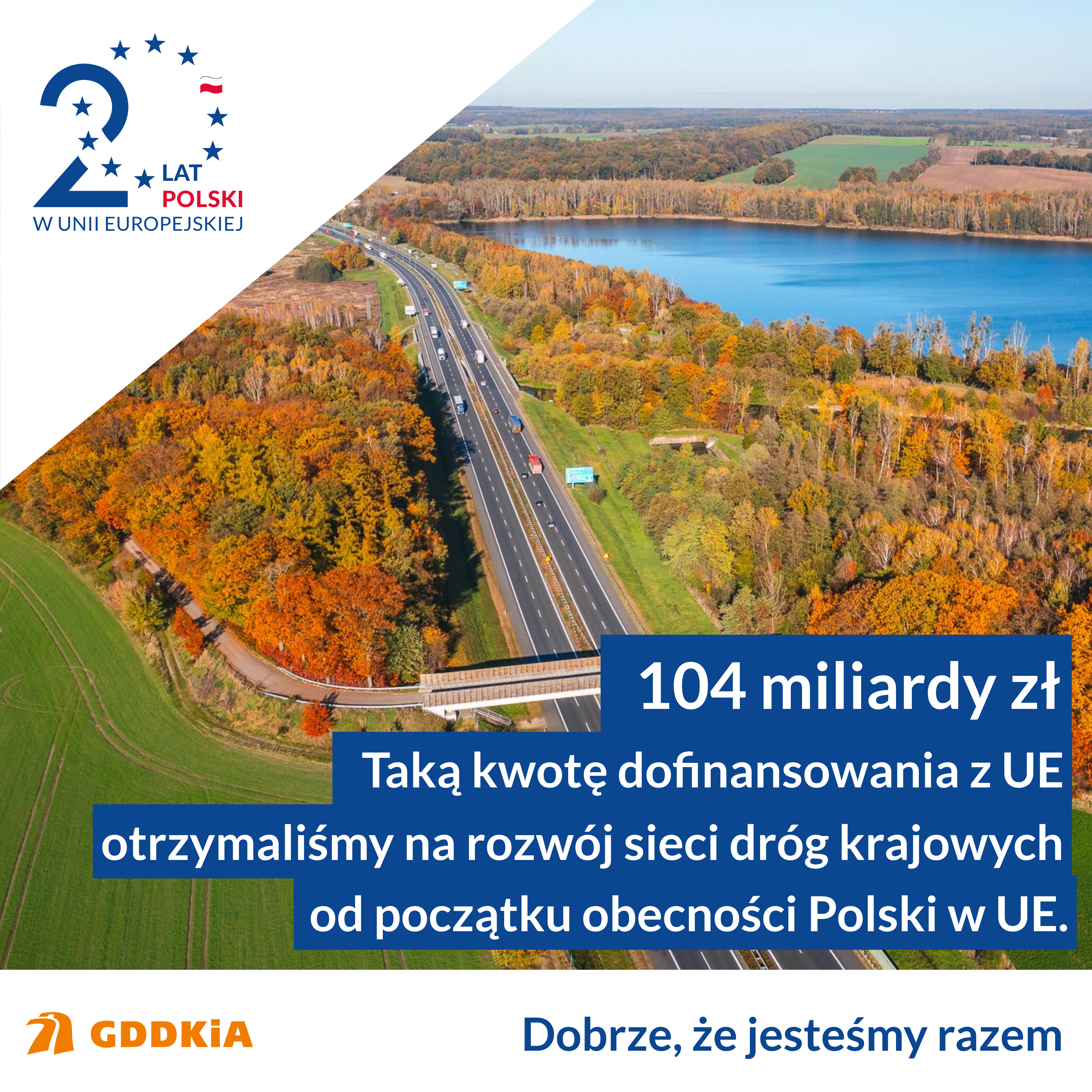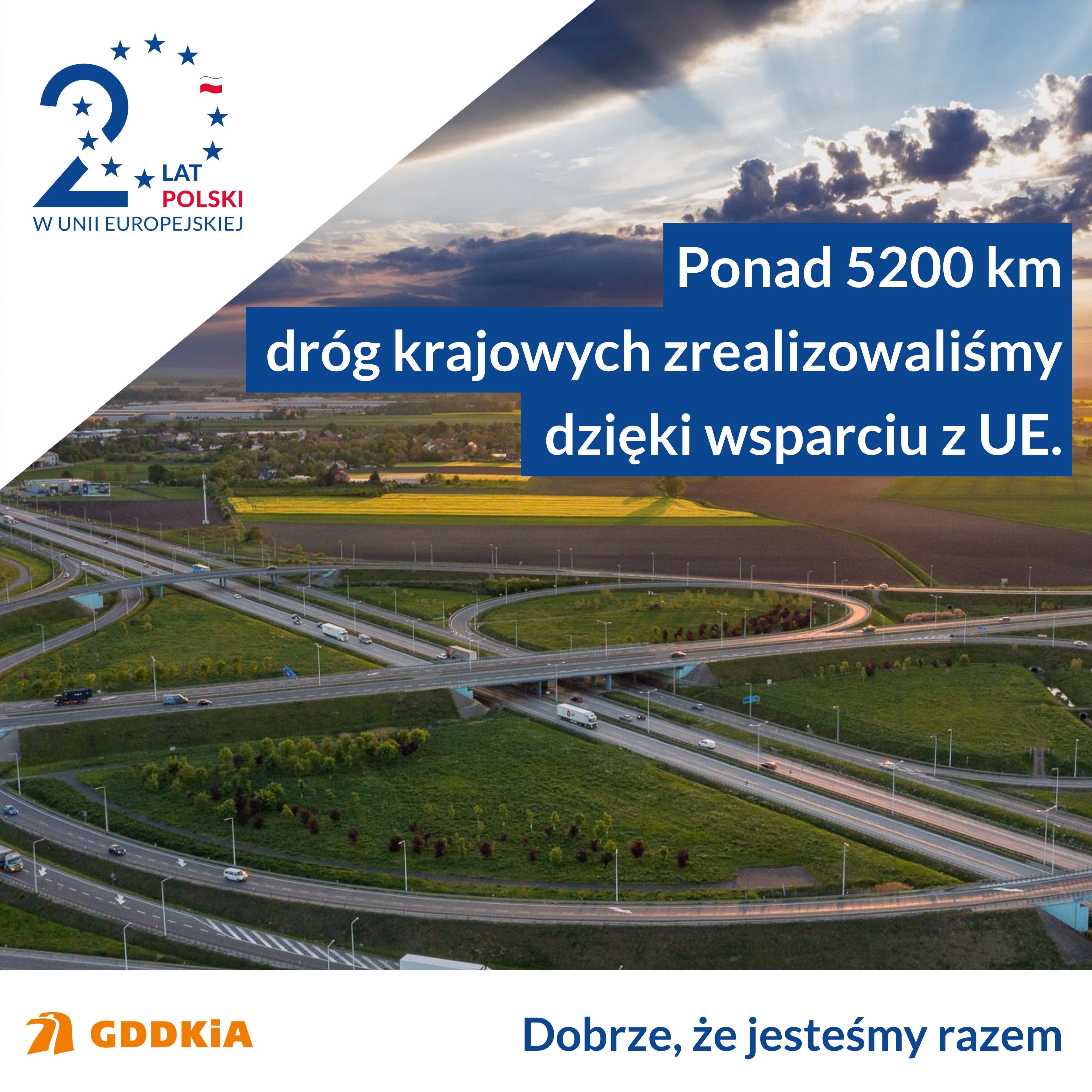 Ponad 5200 km dróg krajowych zrealizowaliśmy z wykorzystaniem ok. 104 mld zł pochodzących z funduszy unijnych. To blisko połowa kwoty jaką Polska od 2004 roku przeznaczyła na rozwój infrastruktury drogowej – ok. 240 mld zł. To najkrótszy bilans wejścia Polski do wspólnoty europejskiej patrząc przez pryzmat rozwoju infrastruktury drogowej. Te inwestycje odmieniły układ komunikacyjny kraju.