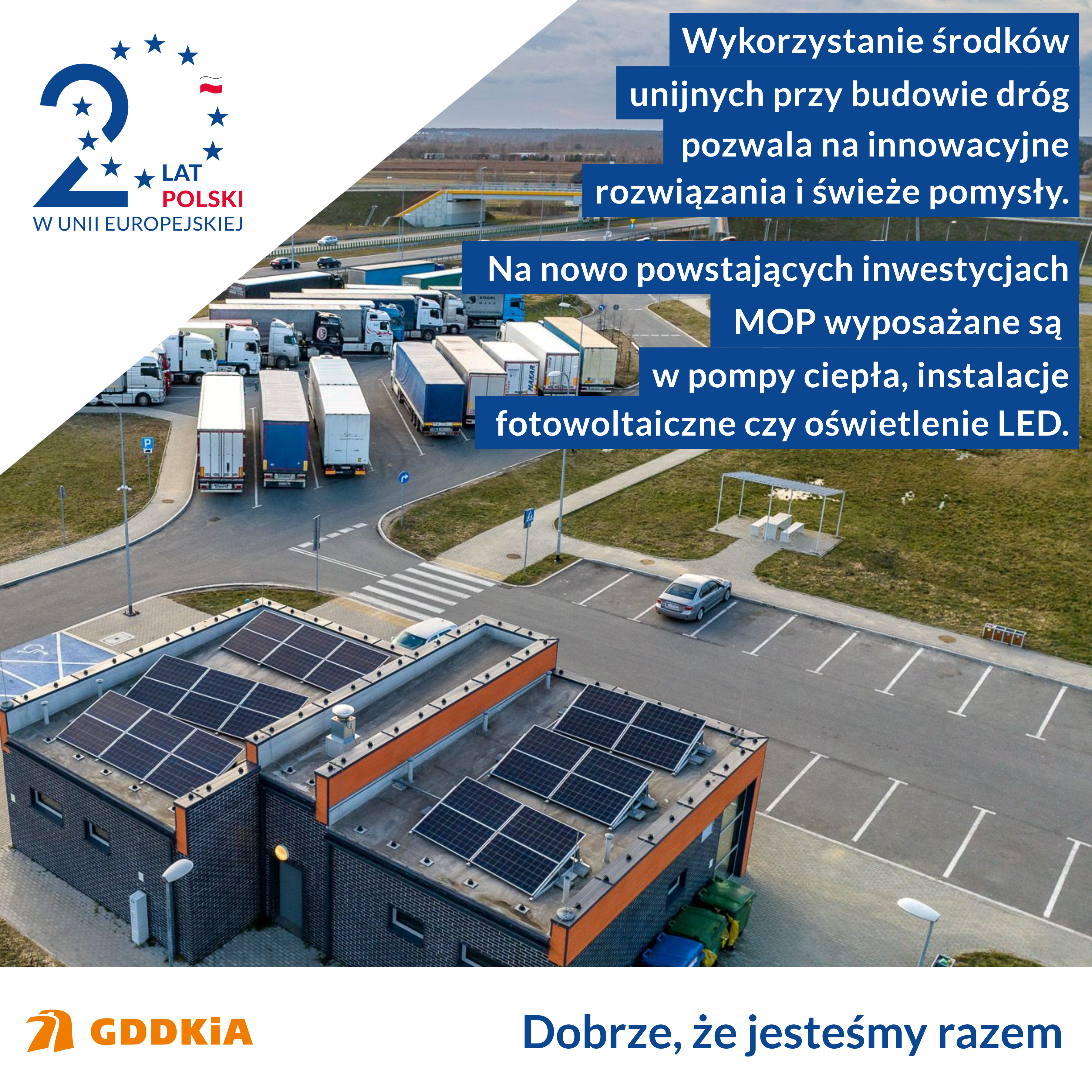 Dbałość o środowisko to także przemyślane rozwiązania z wykorzystaniem technologii odnawialnych źródeł energii. Na nowo powstających inwestycjach, przy udziale dofinansowania ze środków UE, Miejsca Obsługi Podróżnych wyposażane są w pompy ciepła, instalacje fotowoltaiczne czy oświetlenie ledowe.