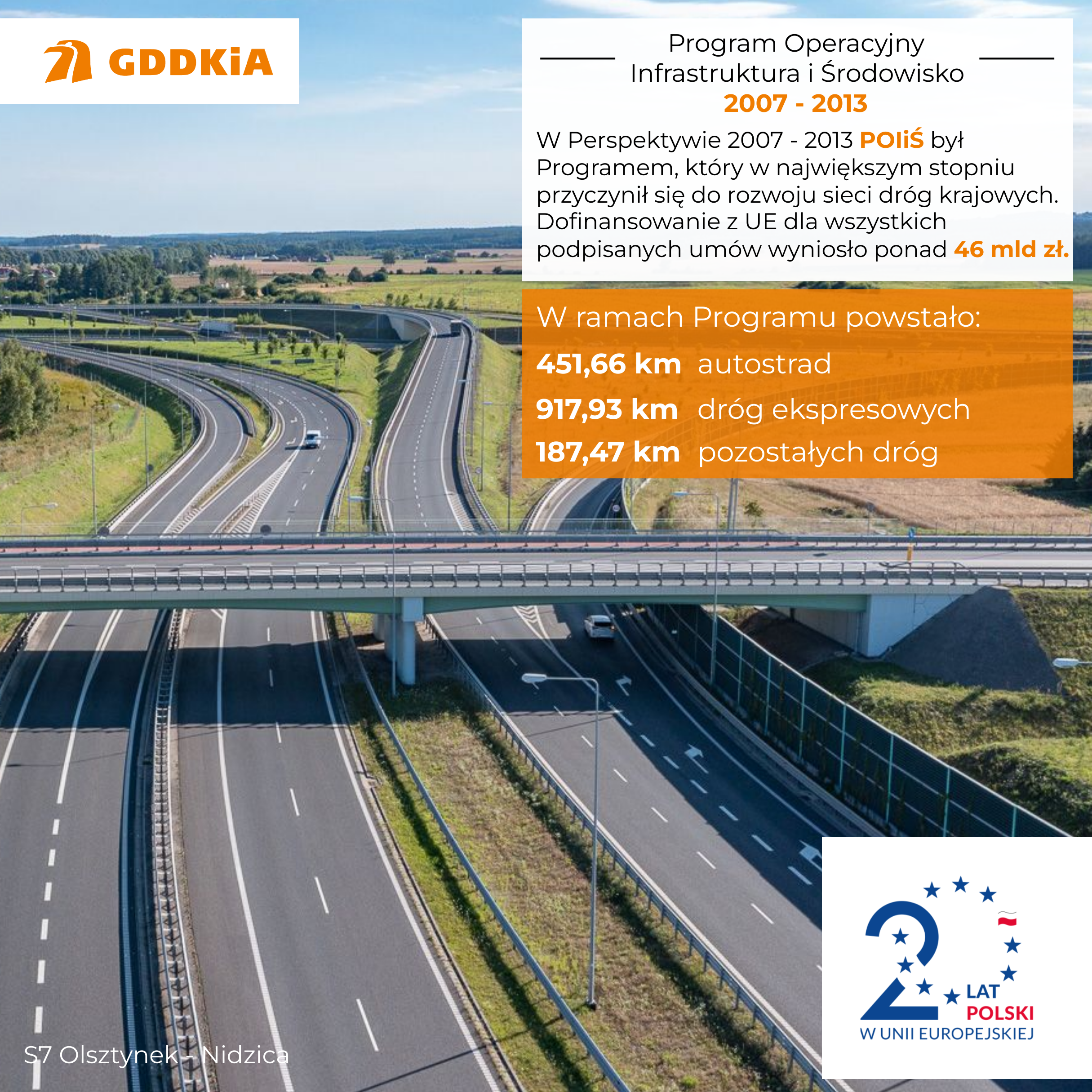 W ramach Programu Operacyjnego Infrastruktura i Środowisko 2007-2013 na realizację 51 projektów przewidziano łączną kwotę alokacji 10,37 mld euro. Przełożyło się to na 46 mld 132 mln zł dofinansowania z Unii Europejskiej, które wykorzystaliśmy na realizację ponad 1500 km dróg krajowych, w tym blisko 454 km autostrad i niemal 920 km dróg ekspresowych. Oddaliśmy do użytku kierowcom m.in. długie odcinki autostrad – A1 od Torunia do Łodzi i od Pyrzowic do Gliwic, A4 od Krakowa do granicy z Ukrainą, dróg ekspresowych – S3 od Szczecina do Sulechowa, S8 od Wrocławia, z autostradową obwodnicą, do Mszczonowa, odcinki S5 w Wielkopolsce i na Dolnym Śląsku, S7 pod Gdańskiem, Elblągiem, Olsztynkiem, Grójcem i Kielcami, czy też wspólny przebieg S12 i S17 w woj. lubelskim.