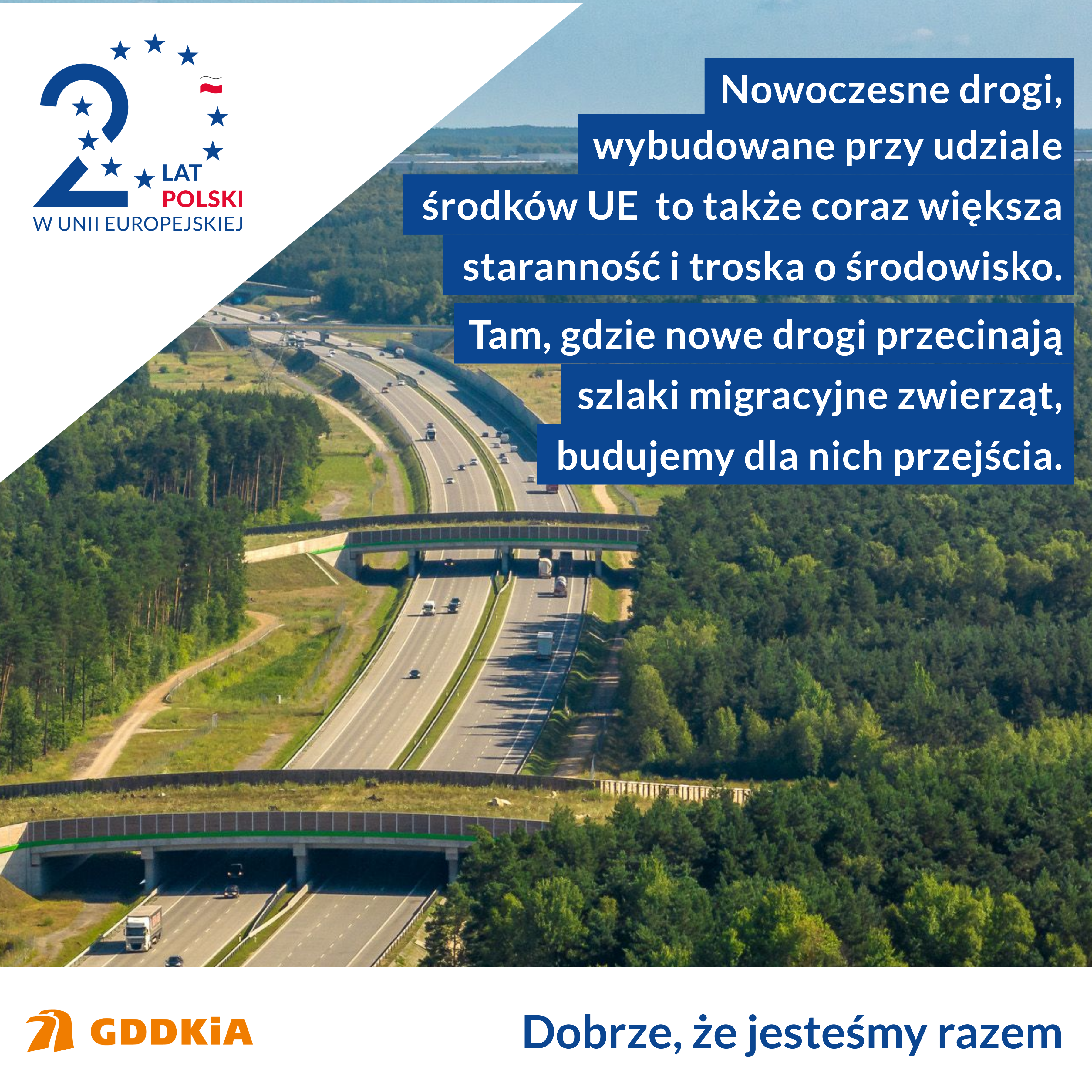 Jednak nowe drogi, to nie tylko dbałość o szybki i sprawny transport oraz bezpieczeństwo użytkowników, ale także coraz większa staranność i troska o środowisko. Chronimy przyrodę, zapewniając jednocześnie bezpieczeństwo użytkownikom dróg i migrującym zwierzętom. Tam, gdzie nowe drogi przecinają szlaki migracyjne zwierząt, budujemy dla nich przejścia. Jednak ochrona środowiska to nie tylko budowa przejść dla zwierząt. W ramach inwestycji drogowych powstają m.in. specjalne wygrodzenia, urządzenia naprowadzające, ekrany akustyczne i przeciwolśnieniowe. Budujemy także zbiorniki retencyjne z separatorami i oczyszczalnie wód.