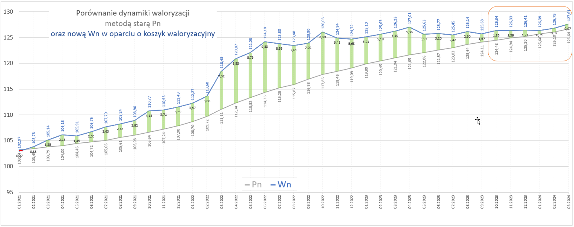 Waloryzacja wg. koszyka waloryzacyjnego reaguje na bieżąco na wszelkie wahania cen, natomiast waloryzacja oparta o wskaźniki Wd i Wm zdecydowanie wolniej oddawała tendencje rynkowe na co wskazano powyżej. W chwili obecnej, między innymi na skutek zmiany metodologii zbierania danych GUS od 2019 roku tempo oddawania zmian cen wg wskaźników Wd i Wm urealniło się, a dziś wartość waloryzacji wyliczona w oparciu o nie jest zbieżna z wartością obliczoną w oparciu o koszyk waloryzacyjny. Poprzez zmianę zasad waloryzacji, zarówno z uwagi na korektę metodologii zbierania danych jak i oparciu jej o koszyk waloryzacyjny de facto doprecyzowana, uściślona i urealniona została pierwotna metoda oparta o wskaźniki Wd i Wm.