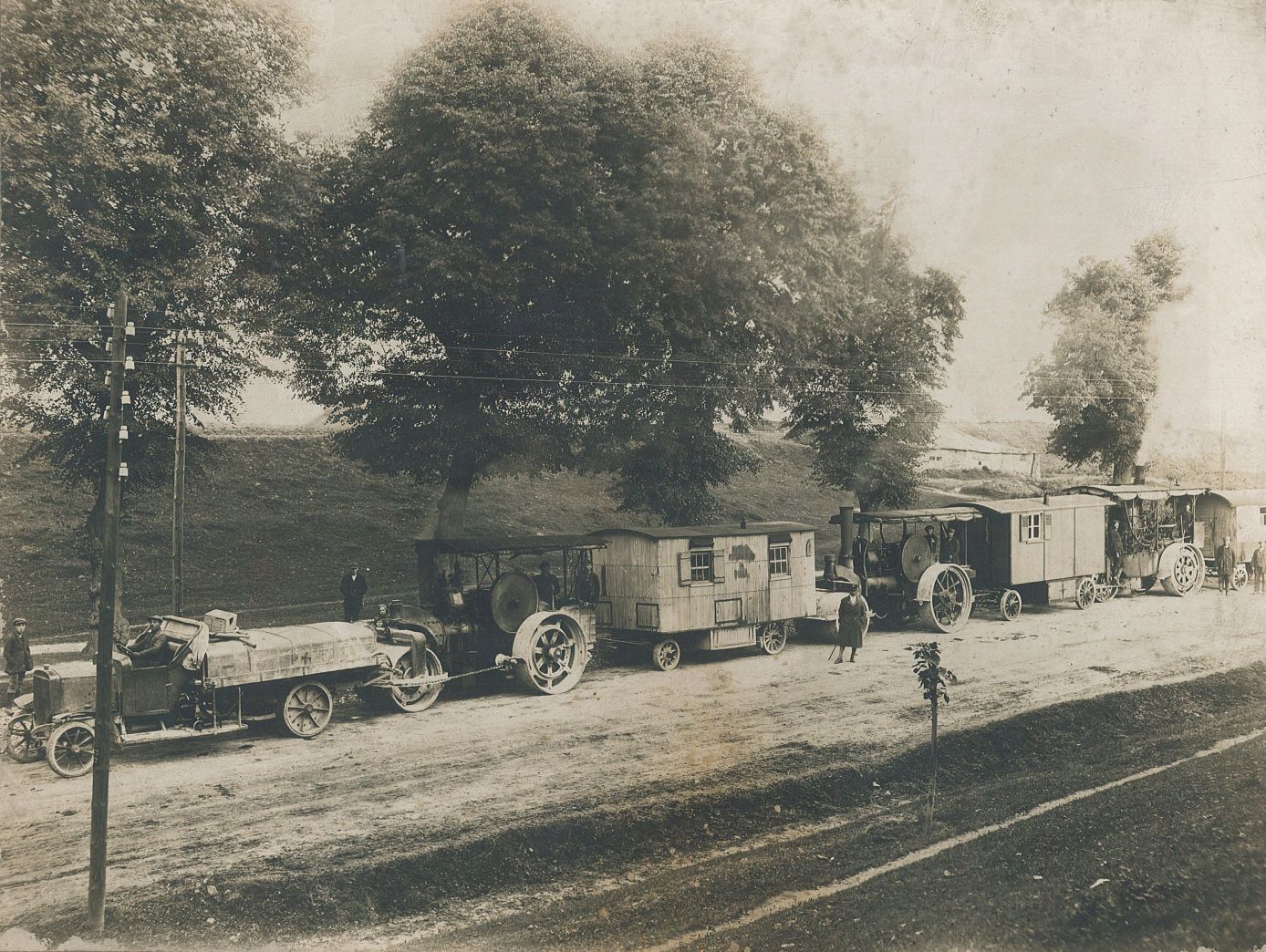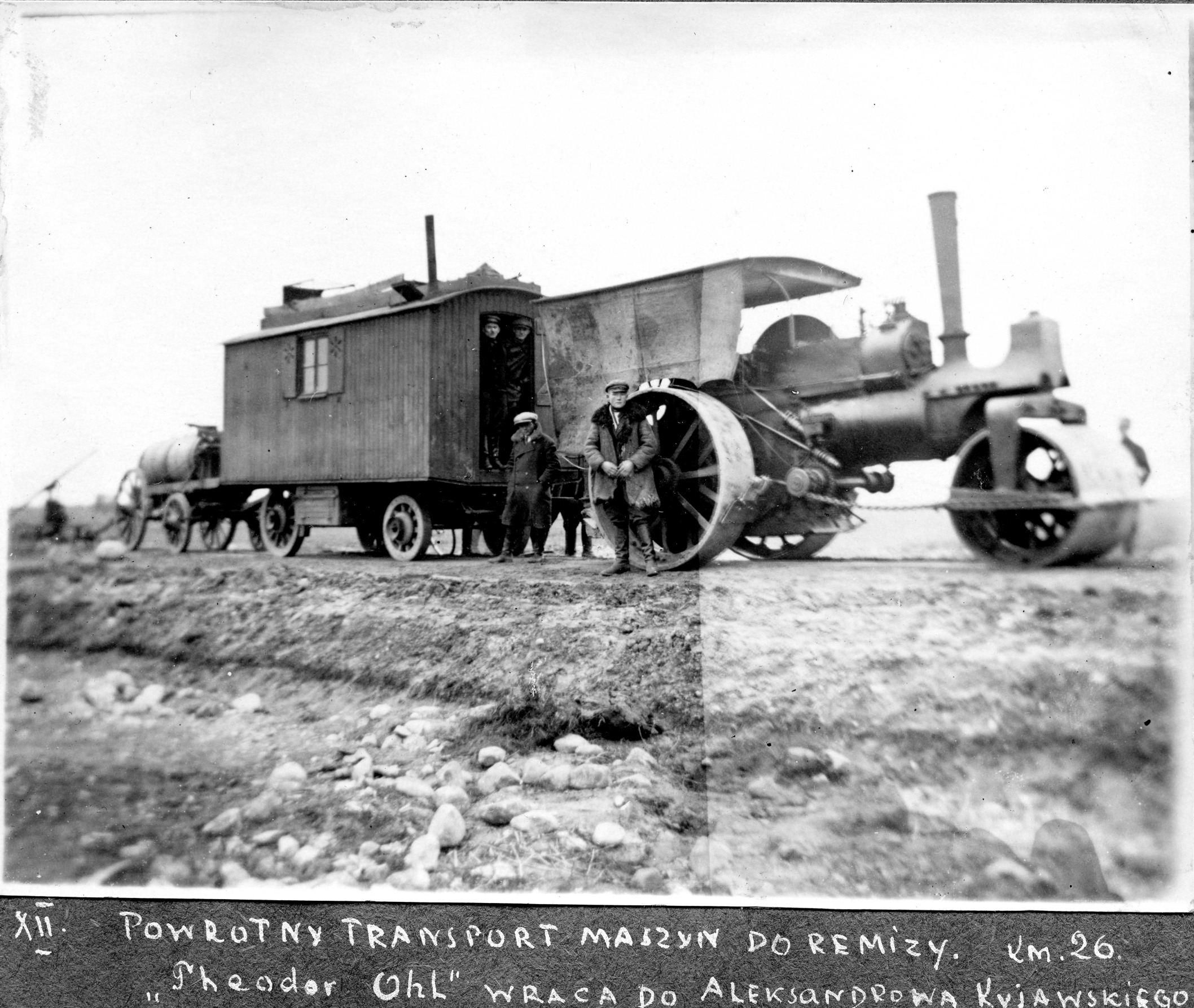 Kolumnę pojazdów otwiera ciężarówka z otwartą kabiną, za którą stoją, "zderzak w zderzak", trzy walce parowe. Do każdego walca podczepiony jest drewniany barakowóz. W pojazdach siedzą lub stoją operatorzy. W tle przydrożna skarpa, na której bujnie rosną drzewa liściaste.