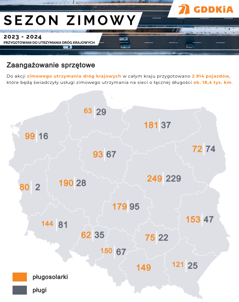 Generalna Dyrekcja Dróg Krajowych i Autostrad utrzymuje ponad 17 800 km dróg krajowych, a z uwzględnieniem dodatkowych jezdni, np. dróg serwisowych, to już ponad 21 000 km. Jest to jednak zaledwie 5 proc. z ponad 420 000 km wszystkich dróg publicznych na terenie naszego kraju. Oprócz dróg krajowych, na terenie Polski są również drogi wojewódzkie, powiatowe i gminne, które utrzymywane i odśnieżane są przez podległe władzom samorządowym zarządy dróg. Miasta na prawach powiatu utrzymują również drogi krajowe, z wyjątkiem autostrad i ekspresówek, jeśli przebiegają w ich granicach administracyjnych.