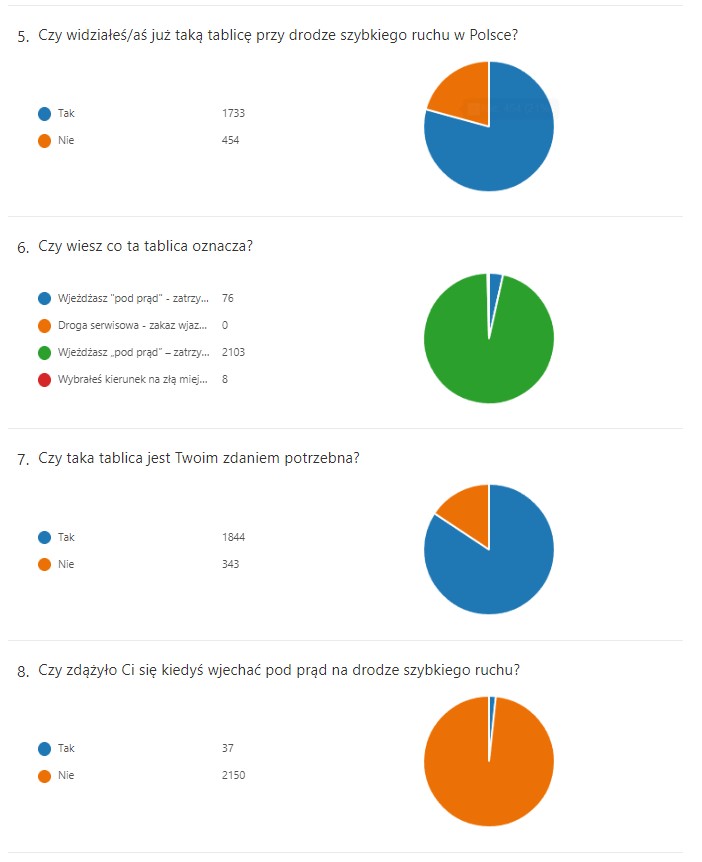 97 proc. uczestników ankiety zaznaczyło poprawną odpowiedź, czyli „Wjeżdżasz pod prąd - zatrzymaj się i natychmiast zawróć”. Z kolei 99 proc. badanych odpowiedziało, że nie zdarzyło się im wjechać pod prąd na drogę szybkiego ruchu. Większość respondentów, dokładnie 85 proc., odpowiedziała też, że nowe tablice są potrzebne.