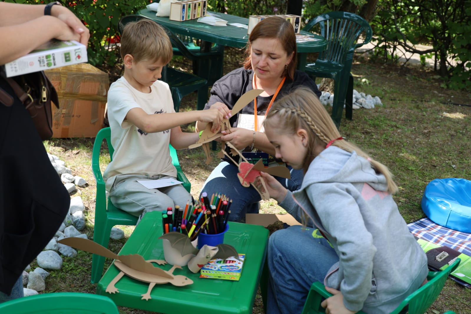 Wielką popularnością cieszyły się zabawy manualne. Można było stworzyć własnego nietoperza, fantazyjnie pokolorować traszkę grzebieniastą czy nakarmić jeża. Milusińscy mieli okazję poznać i sfotografować się z naszą maskotką – sową Gdosią.