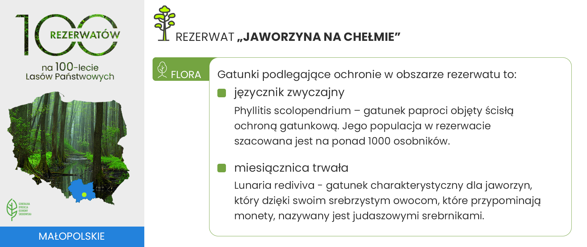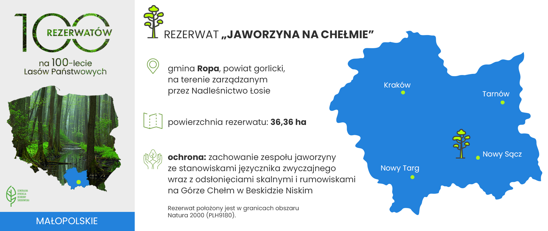 Z okazji 100-lecia Lasów Państwowych, w województwie małopolskim powstały 4 nowe rezerwaty przyrody. Jednym z nich jest „Jaworzyna na Chełmie”, który ochroni cenne zbiorowisko jaworzyny z języcznikiem.