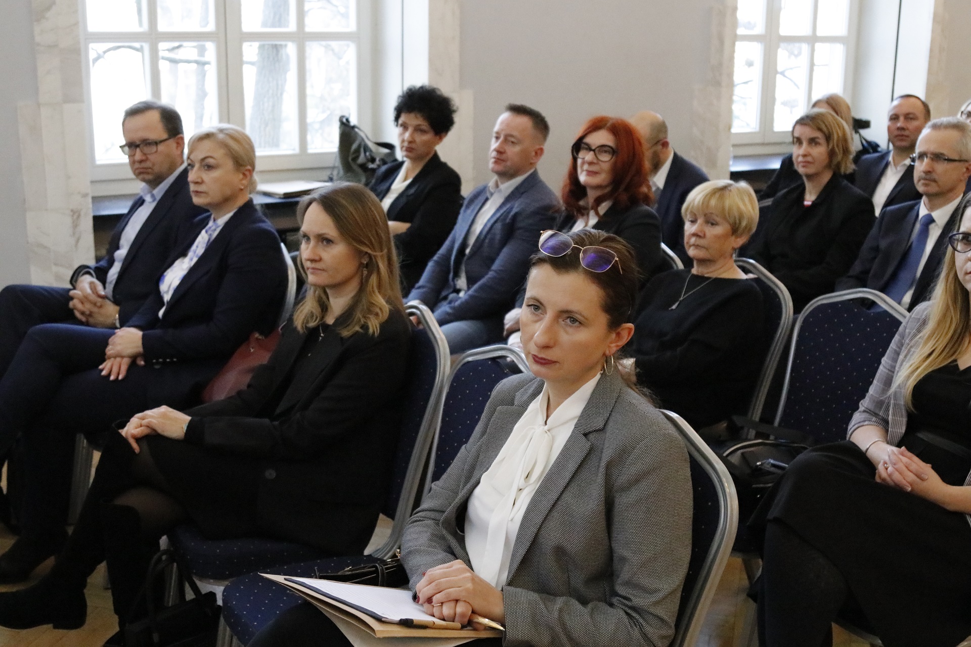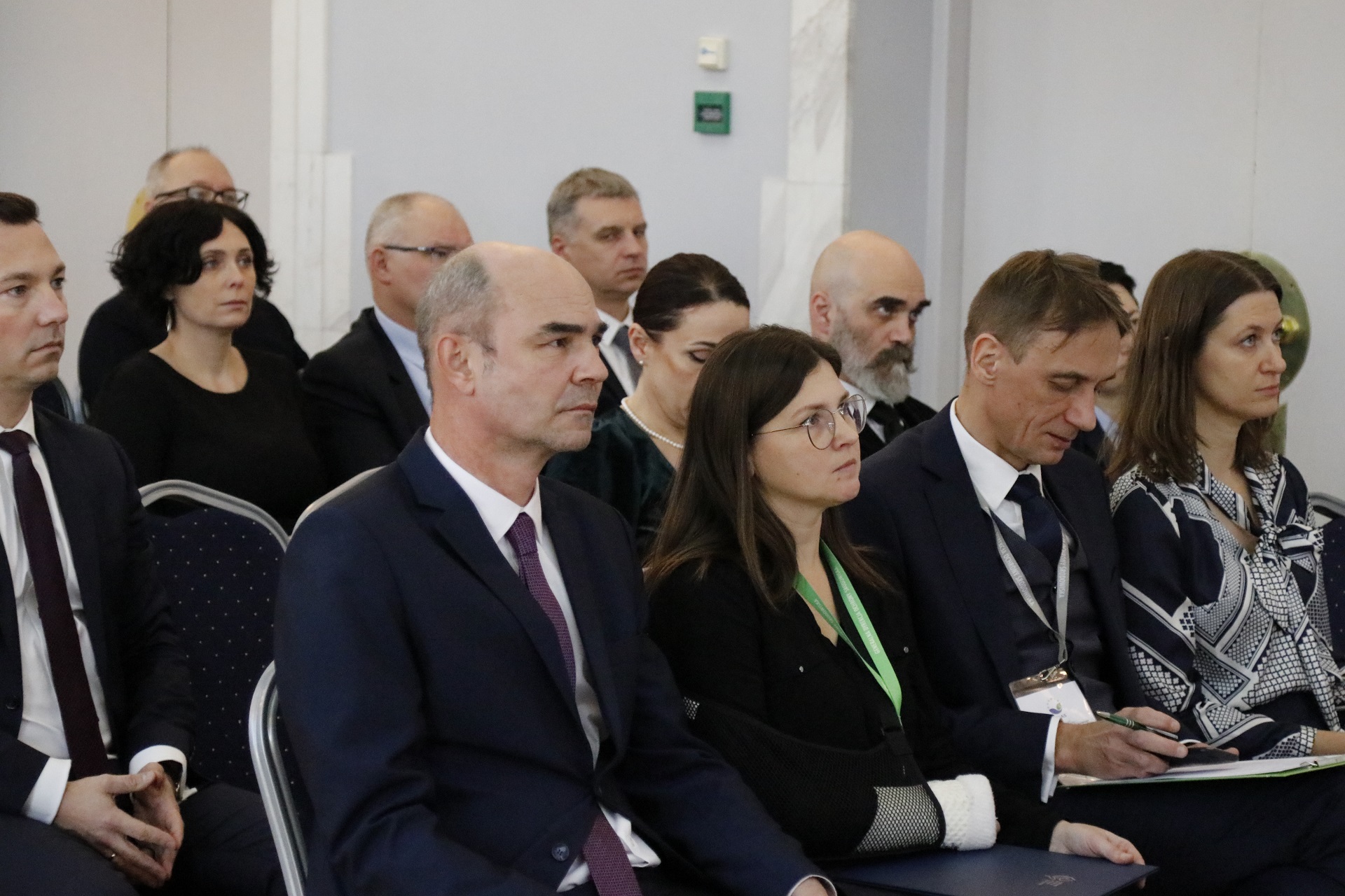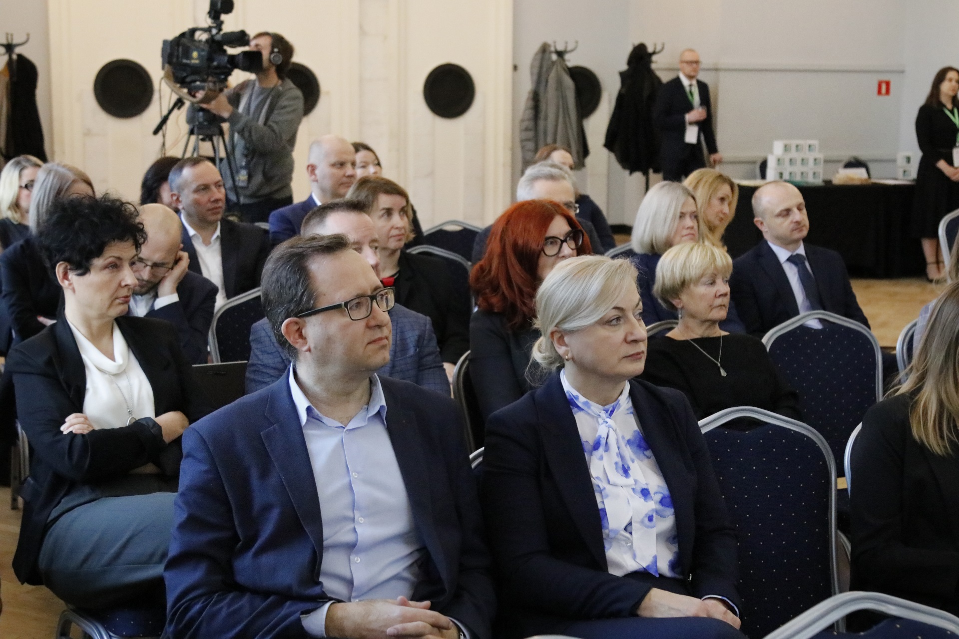 Widok sali konferencyjnej. Na pierwszym planie uczestnicy zwróceni twarzami do przemawiającego Generalnego Dyrektora Ochrony Środowiska - Andrzej Szwedy - Lewandowskiego.