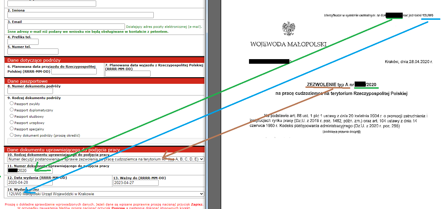 - თუ აირჩევთ „ეროვნული ვიზა - სამუშაო“, შეავსეთ წინასწარი სავიზო განაცხადი, რომელიც შეიცავს თქვენს პირად მონაცემებს და იმ დოკუმენტის მონაცემებს, რომელიც პოლონეთში მუშაობის დაწყების უფლებას გაძლევთ (ინფორმაციას იხილავთ გვერდის ბოლოს). თუ შეყვანილი მონაცემები სწორია, შეტყობინებას მიიღებთ ელ-ფოსტაზე სრული სავიზო განაცხადის შესავსებ ბმულთან ერთად. 48 საათი გაქვთ განაცხადის სრულად შესავსებად. შეავსეთ განაცხადი, ჩაწერეთ და ამობეჭდეთ. თუ მონაცემები არ იქნება სწორედ მითითებული ან 48 საათის განმავლობაში სრულ განაცხადს არ შეავსებთ, რეგისტრაცია გაუქმდება;