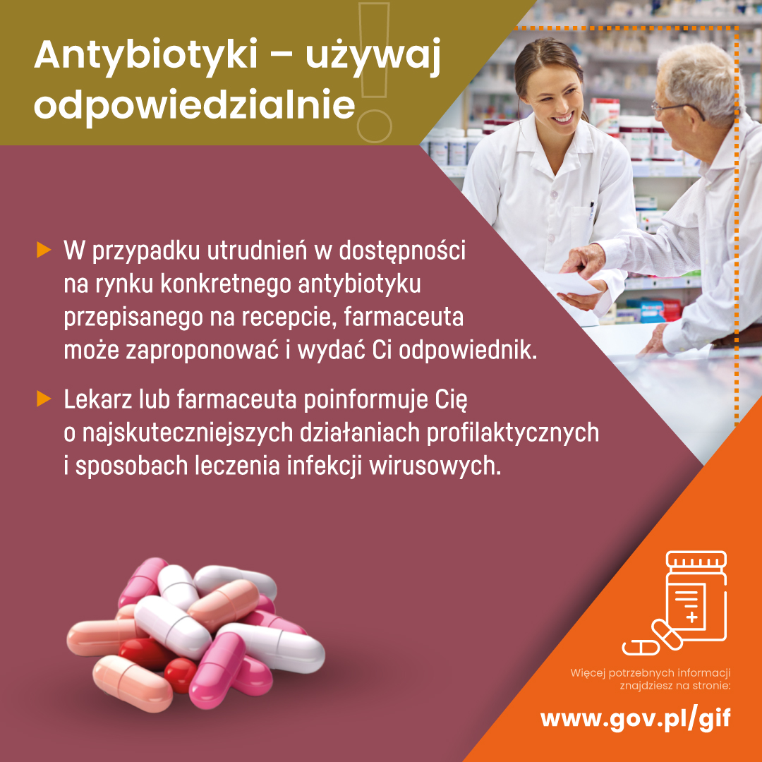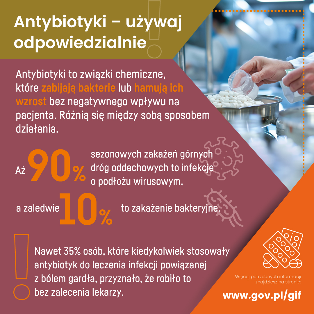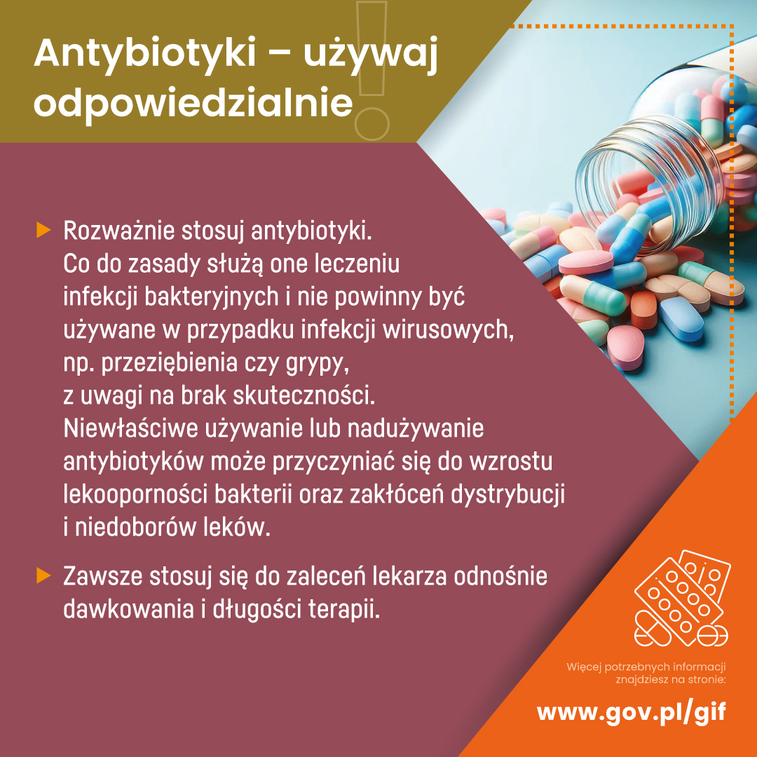 W trwającym od 18 do 24 listopada Światowym Tygodniu Wiedzy o Antybiotykach Główny Inspektorat Farmaceutyczny przypomina najważniejsze zasady stosowania antybiotyków. W ramach wydarzenia GIF uruchamia w mediach społecznościowych drugą część kampanii „Antybiotyki – używaj odpowiedzialnie”. Zapraszamy do zapoznania się z materiałami, które powstały w ramach kampanii.