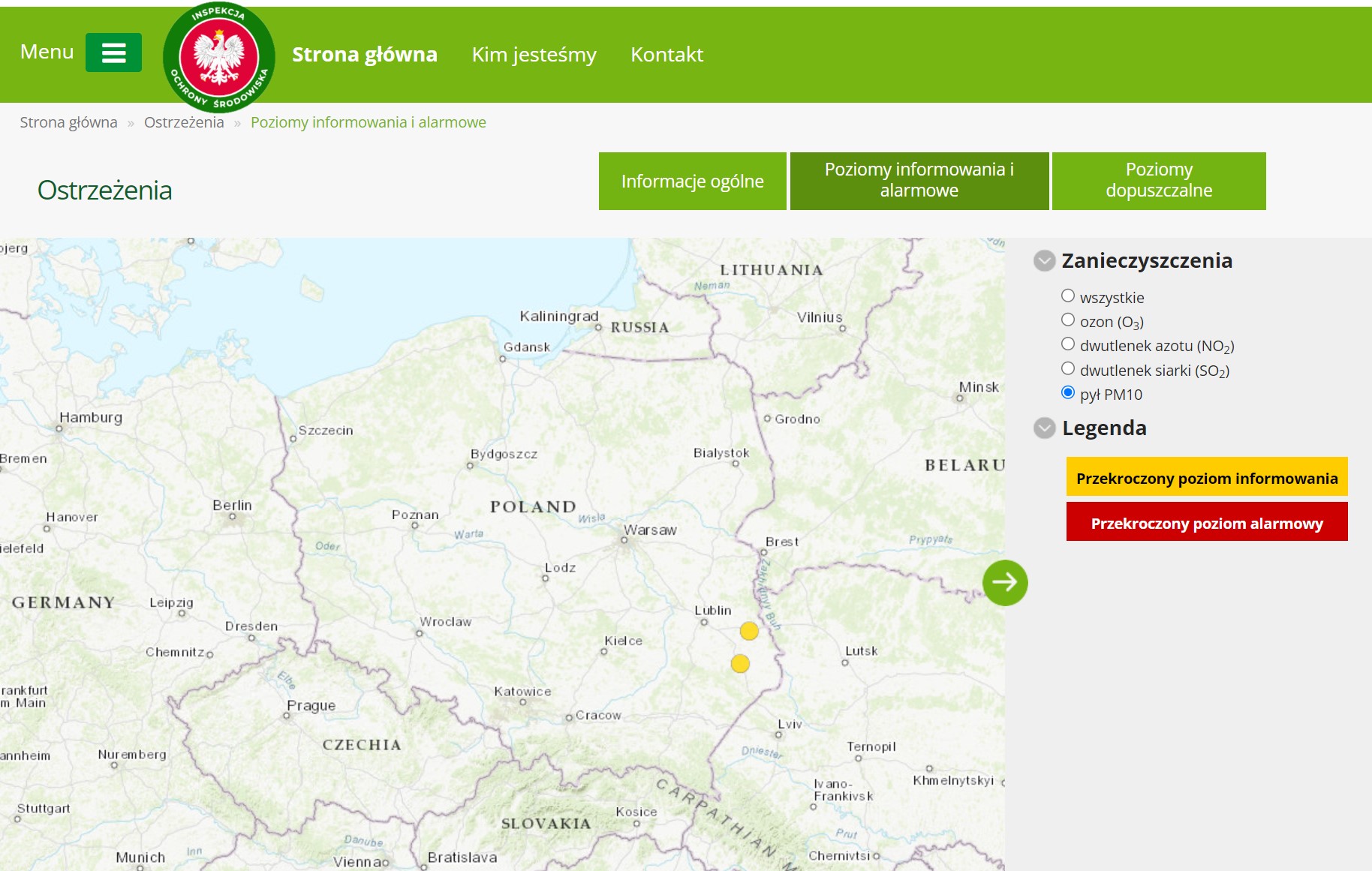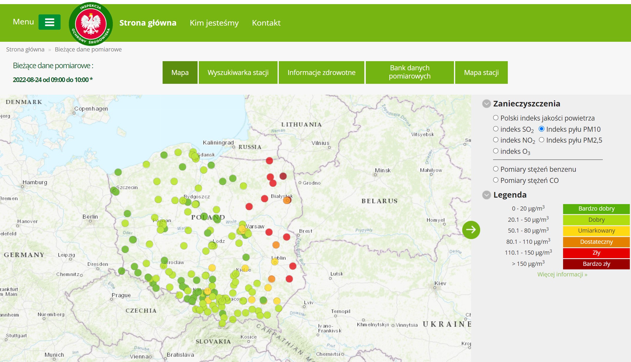 Aktualnie wysokie stężenia pyłu zawieszonego PM10 utrzymują się w pasie województw wschodniej Polski. Według danych pomiarowych z godz. 10:00 najwyższe stężenia jednogodzinne pyłu zawieszonego PM10 wystąpiły na stacjach monitoringu jakości powietrza: