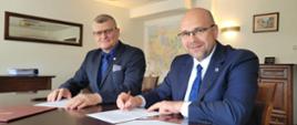 Główny Inspektor Sanitarny i rzecznik Praw Pacjenta podpisują druki porozumienia. Siedzą za stołem, z piórami w dłoniach.