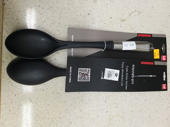 Produkt – Łyżka z poliamidu w kolorze czarnym z metalowym uchwytem, C&E, nazwa na etykiecie w języku polskim: „Naczynie kuchenne ITEM NO: 915-0B8496”