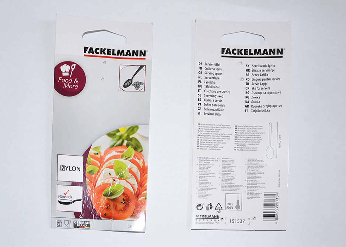 Opis produktu: Łyżka z nylonu barwy czarnej, na uchwycie tłoczenie: +210°C oraz symbol dopuszczający wyrób do kontaktu z żywnością. Do uchwytu dołączona oryginalna etykieta o treści: PL ŁYŻECZKA PL FACKELMANN Polska Sp. z o.o., Tomice, ul. Europejska 13, 05-532 Baniocha info@fackelmann.pl FACKELMANN GERMANY www.fackelmann.com 151537, , ca. 32,5 cm, Made in China ES0515HY
