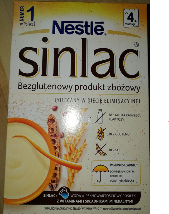 Państwowa Inspekcja Sanitarna wykryła przekroczenie najwyższego dopuszczalnego poziomu kadmu w badanej próbce produktu Nestlé Sinlac Bezglutenowy produkt zbożowy po 4 miesiącu, 500 g, numer partii / najlepiej spożyć przed końcem: 01970291R / 09/2021, wyprodukowany przez Nestlé Polska S.A. ul. Domaniewska 32 02-672 Warszawa.