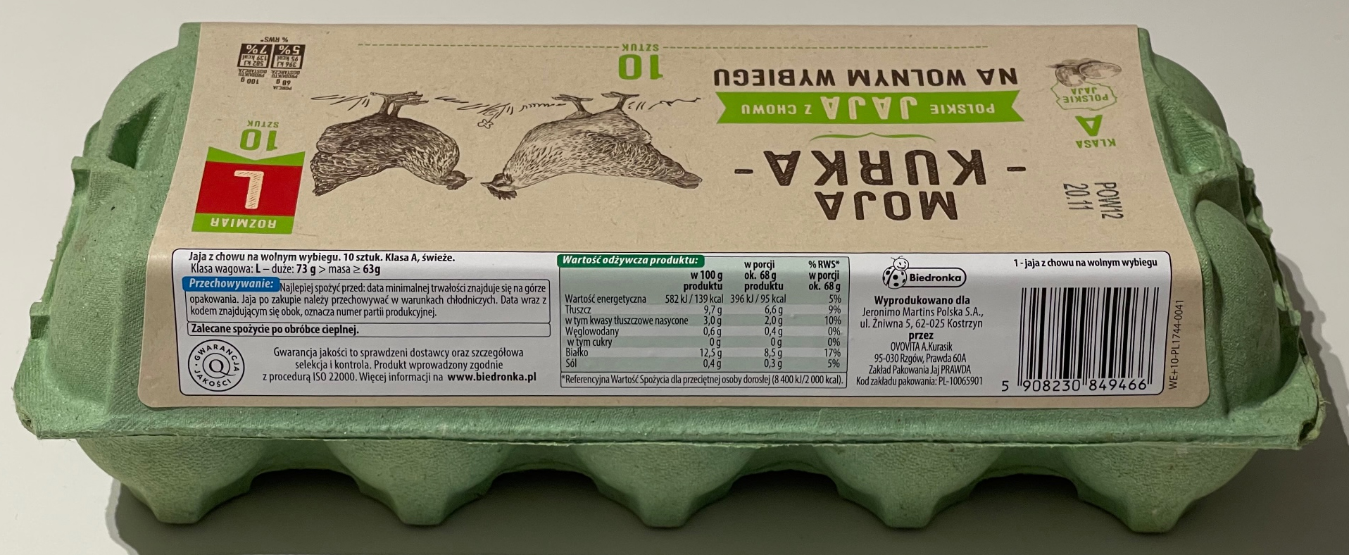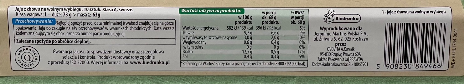 Wyprodukowano przez: OVOVITA A. Kurasik 95-030 Rzgów, Prawda 60A Zakład Pakowania Jaj Prawda, kod zakładu pakowania: PL-10065901.